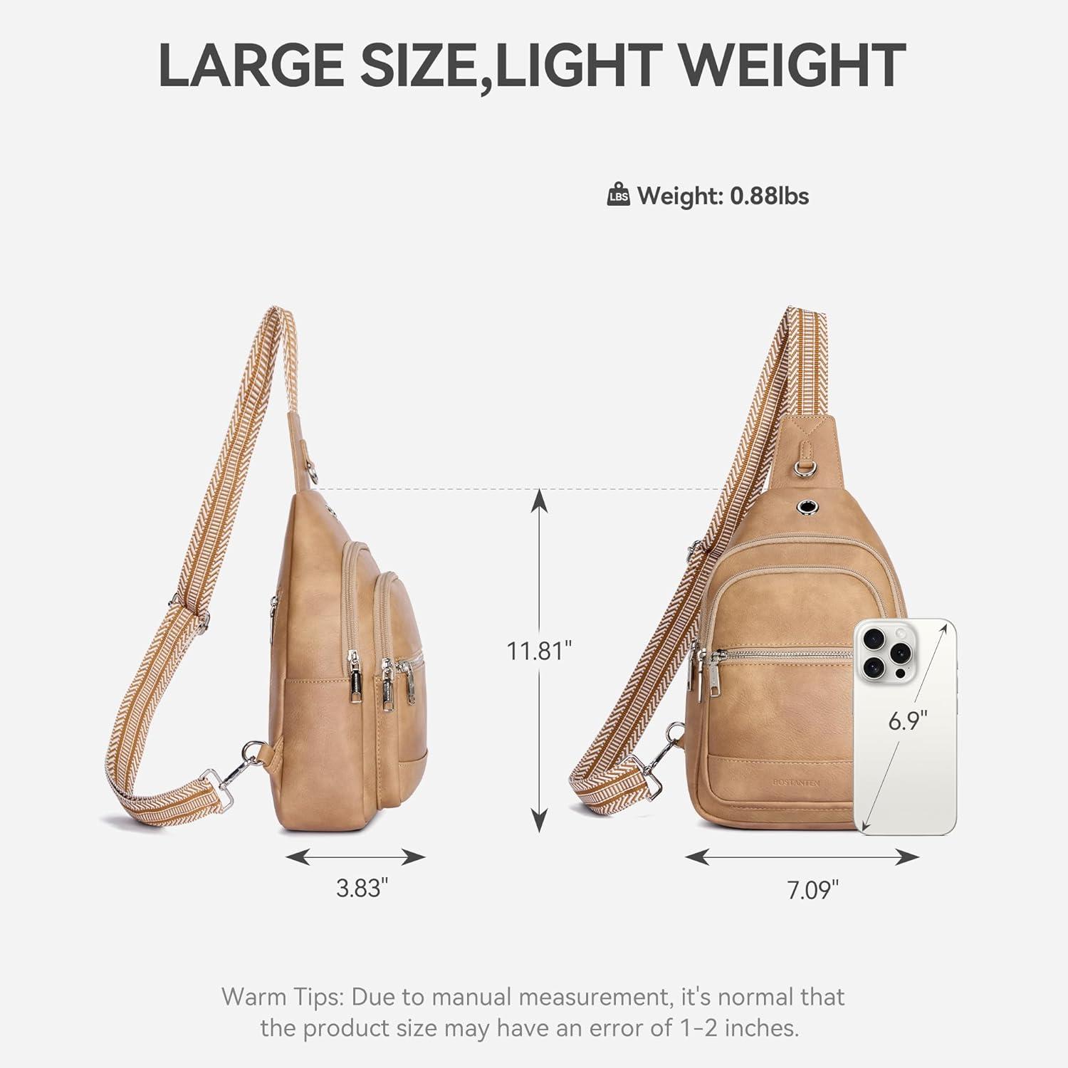 7L Crossbody Bags for Women : The sling bag measures 11.81'' x 7.09'' x 3.83'' and weighs only 0.88 lbs. Its spacious design easily holds more than a standard cross body bag while remaining lighter and more streamlined than a backpack. Whether traveling through Europe, attending music festivals, or just shopping, walking dog, babysitting, it becomes your reliable companion, keeping belongings organized and freeing your hands for life's moments