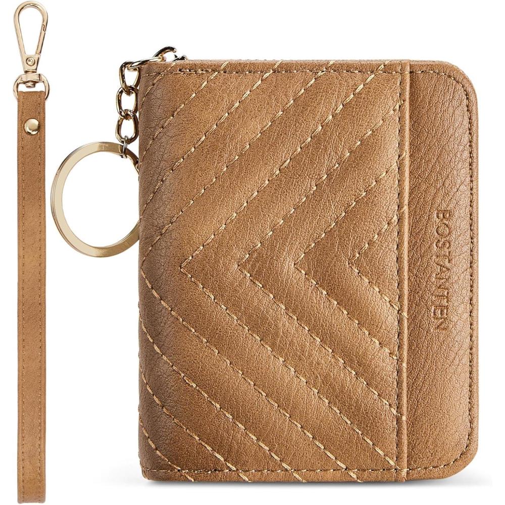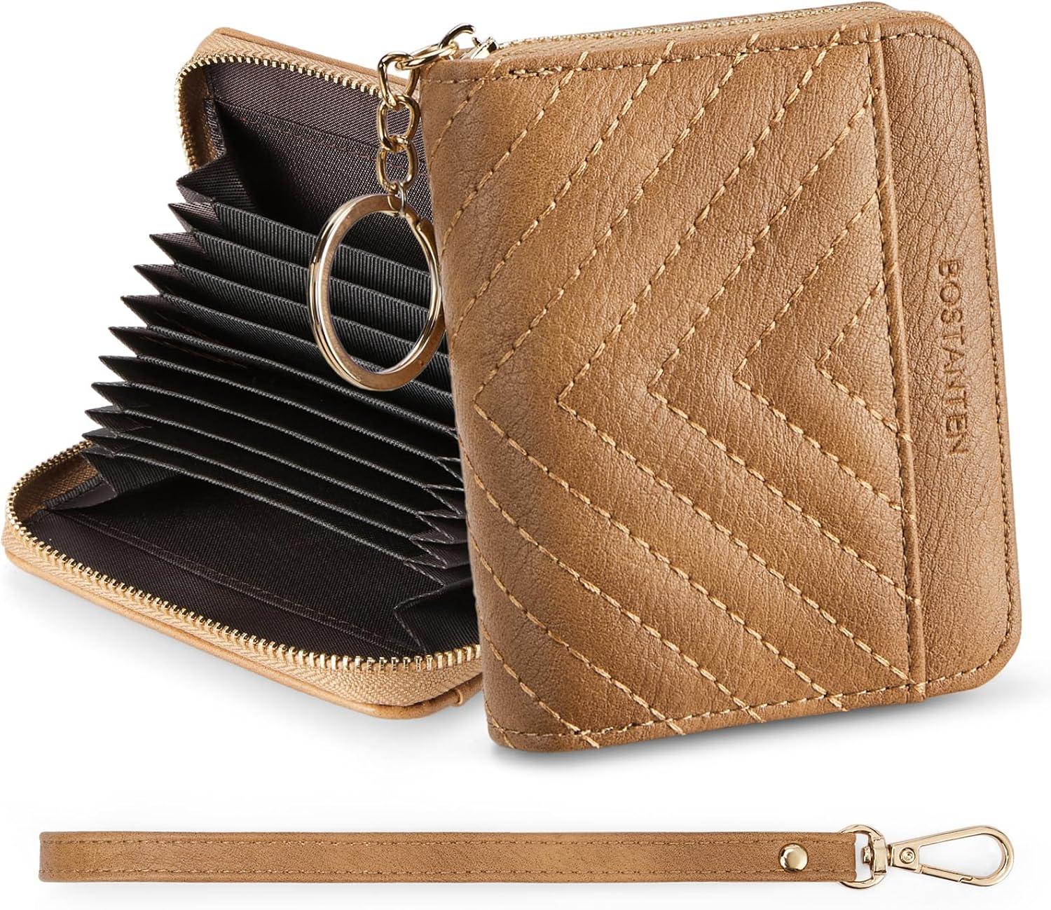 BOSTANTEN Credit Card Holder Wallet RFID Blocking Leather Small Wallet for Women Zipper Keychain Wallet with Wristlet Black(Camel)