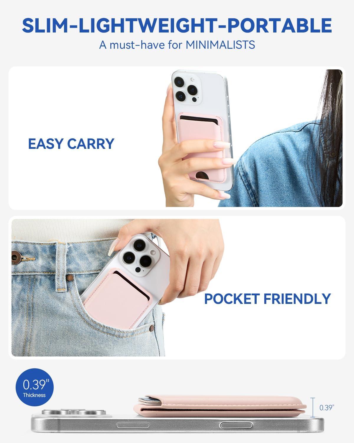Minimalist: Size 3.74''x2.55''x0.39'', 0.13 lbs weight. The magsafe phone wallet with slim design doesn't add much bulk to your phone. This Mag-Safe wallet is a great choice if you're looking for a slim, minimalist way to carry a few cards with your iPhone. Great for traveling or quick trips!