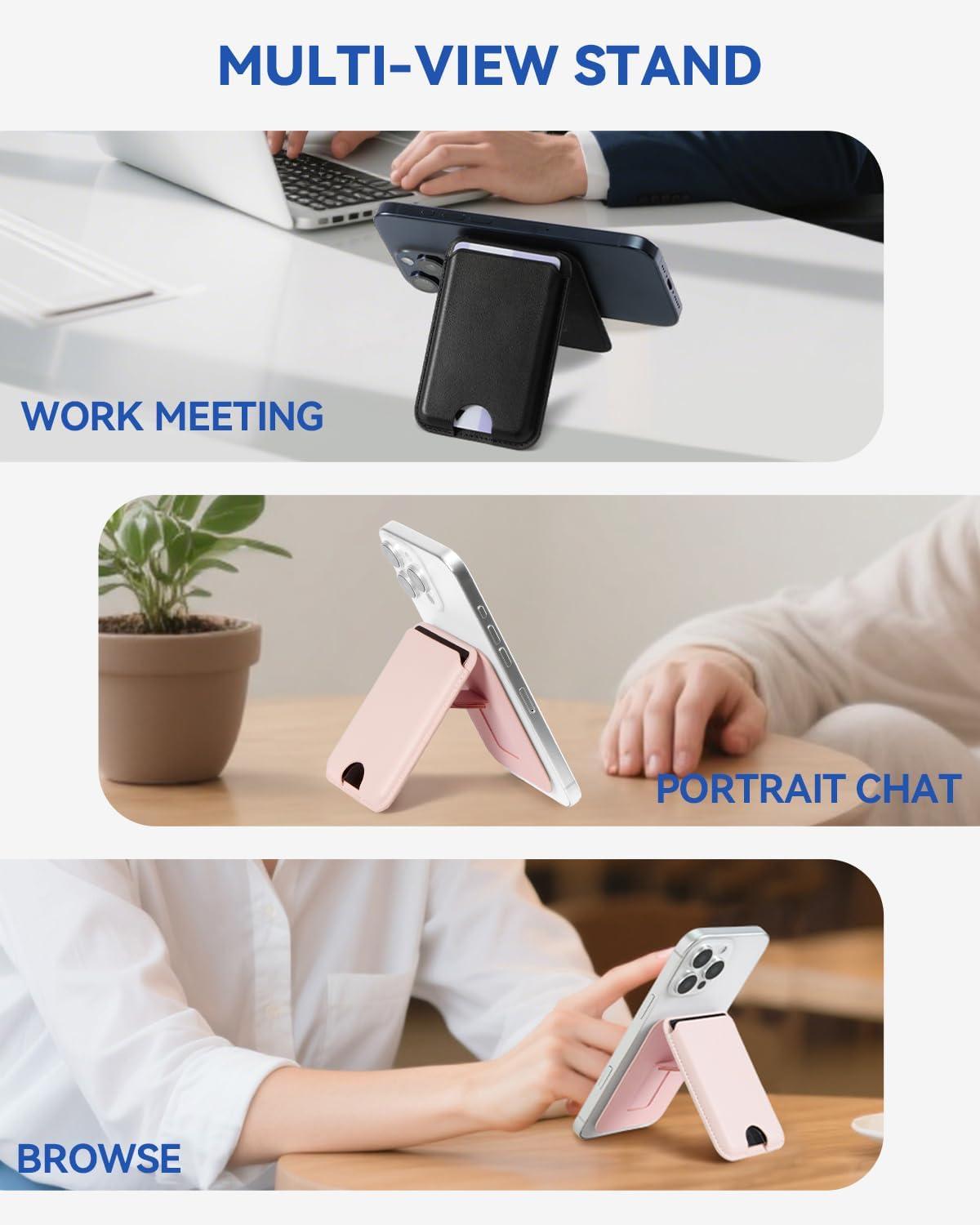 No-Slip Phone Wallet Stand: This mag safe wallet features a stable stand and will not slip when in use. Our magnetic wallet supports both landscape and portrait modes that perfect for hands-free viewing, video calls, or reading. Mag wallet is a must-have for effortless convenience.