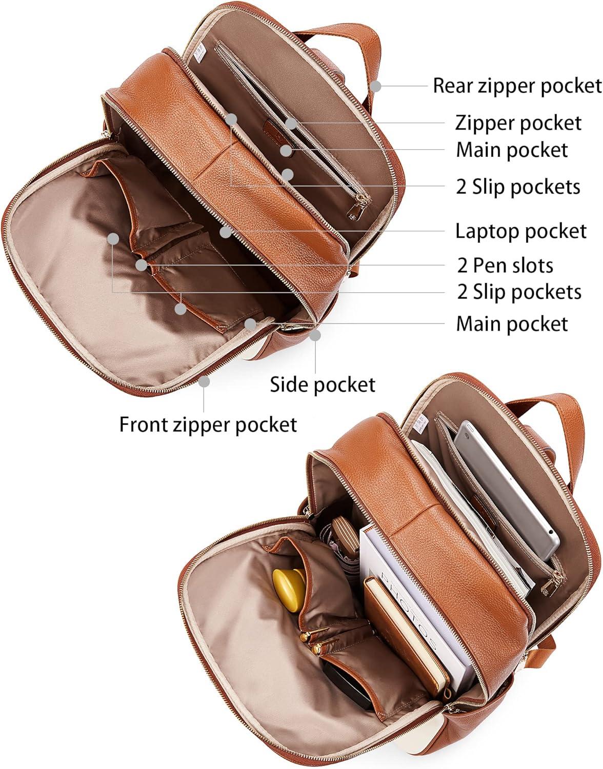 imageBOSTANTEN Genuine Leather 156 inch Laptop Backpack Purse for Women College Casual Backpack Travel Bag1dbeige With Brown