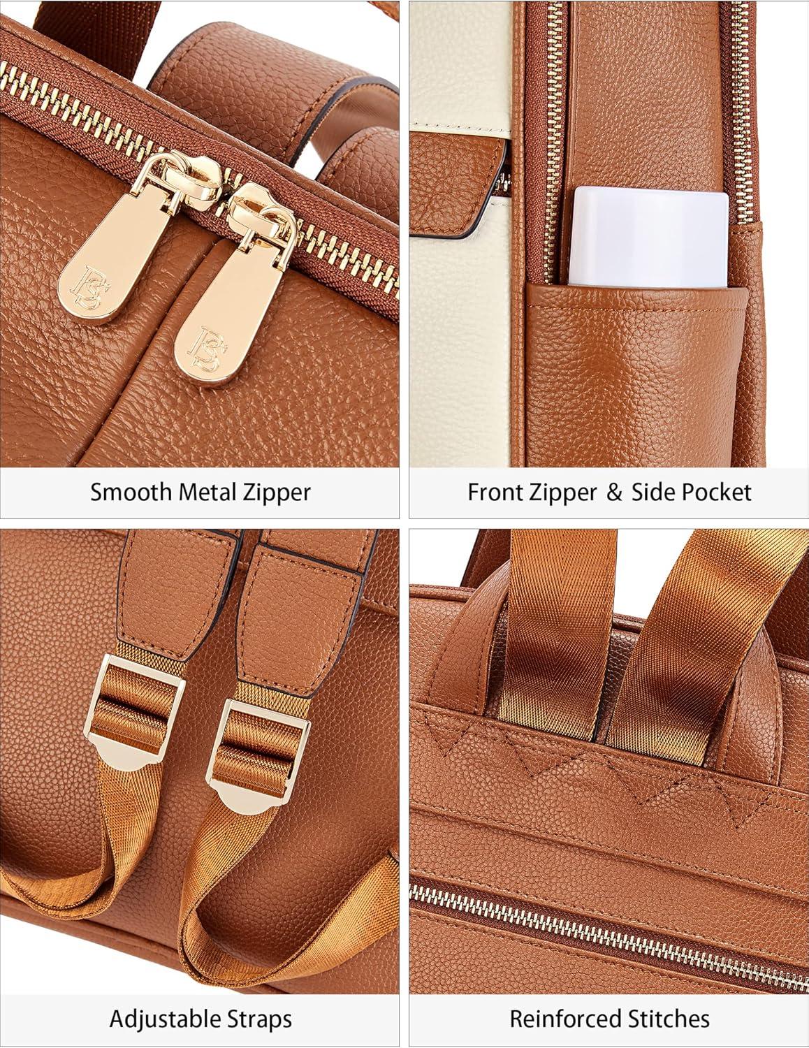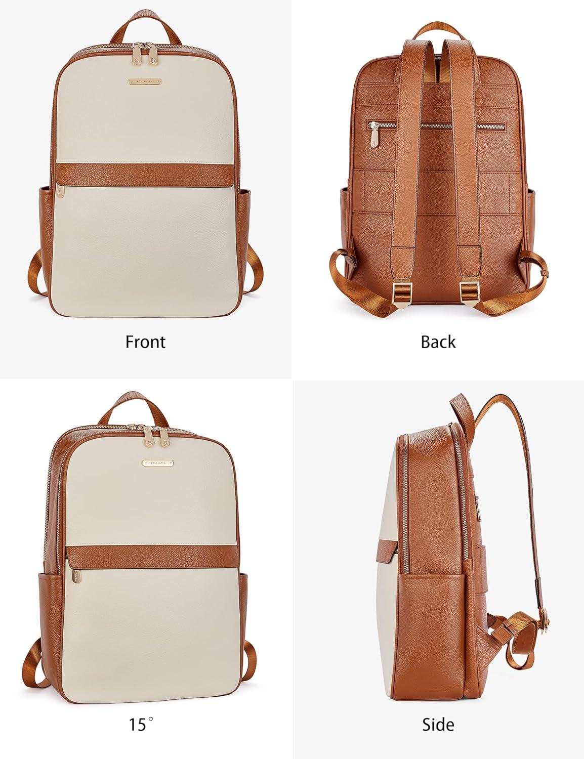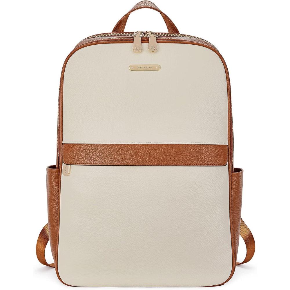 BOSTANTEN Genuine Leather 15.6 inch Laptop Backpack Purse for Women College Casual Backpack Travel Bag(1-d-beige With Brown)