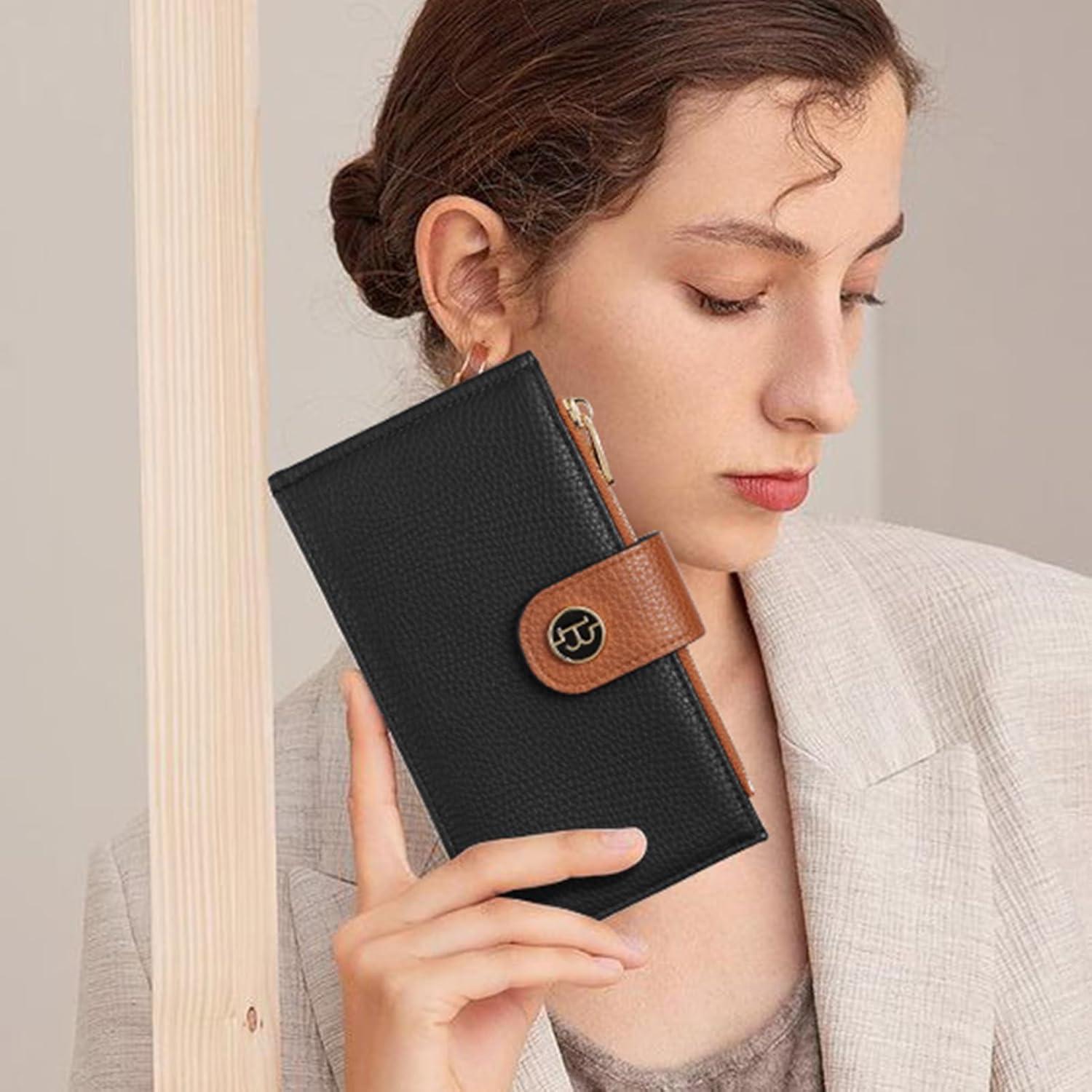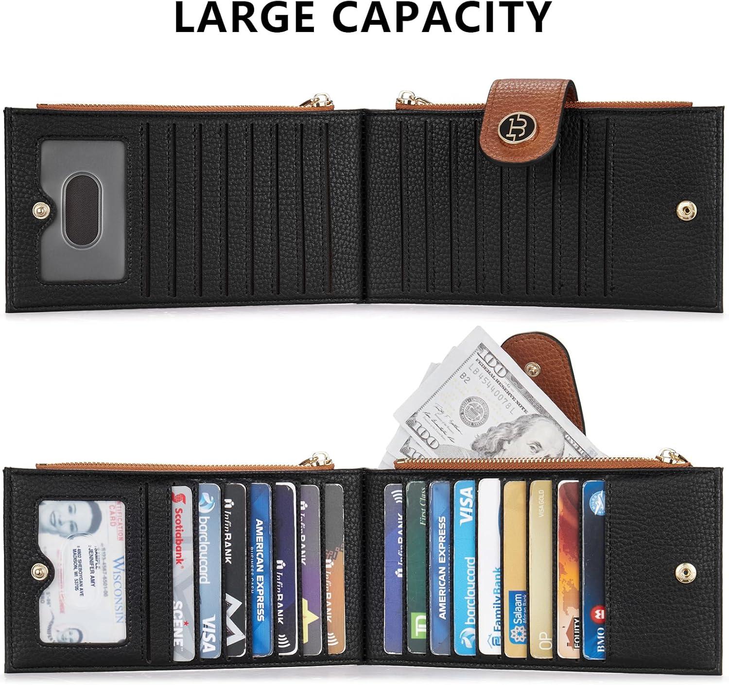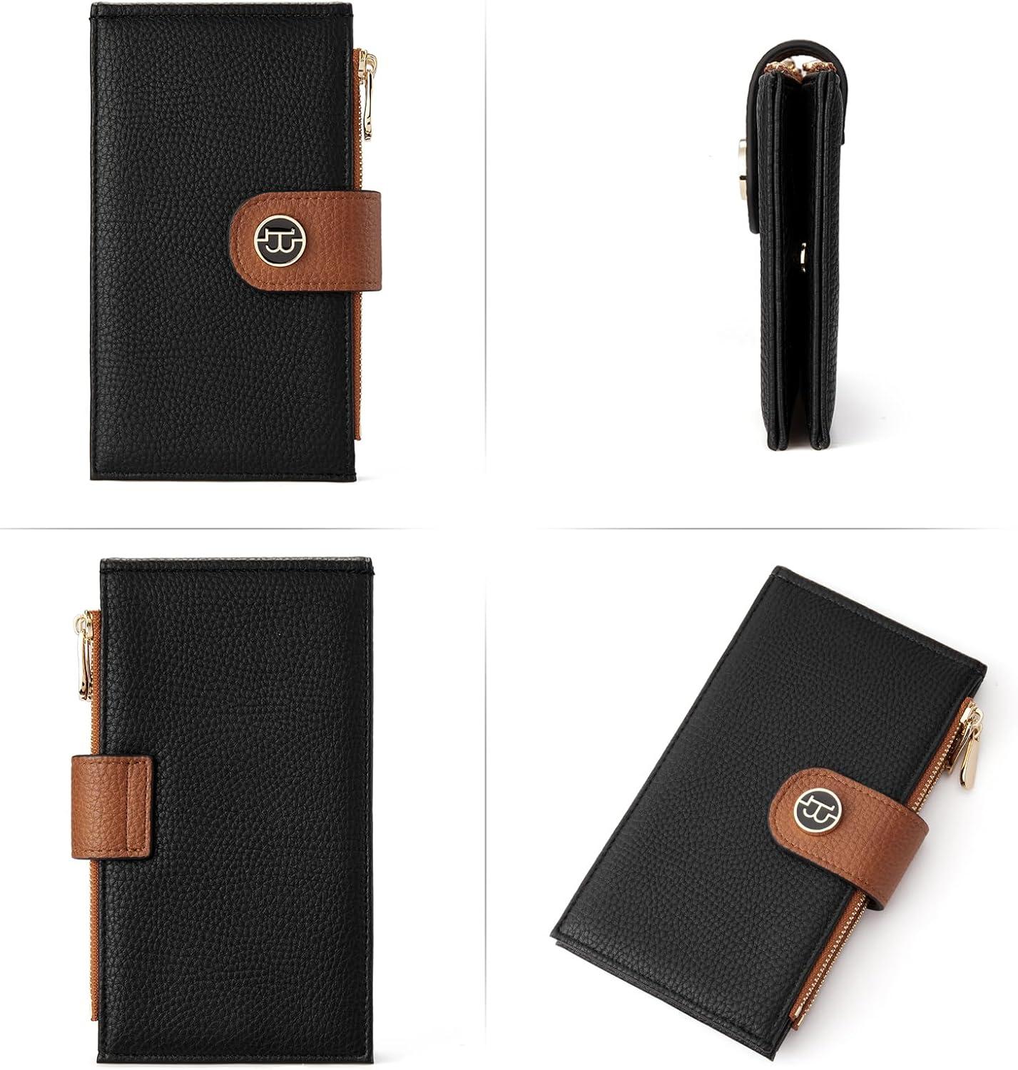 BOSTANTEN Leather Wallets for Women Large RFID Blocking Slim Bifold Purse Card Holder with Zipper Pocket(1-Black+Brown)