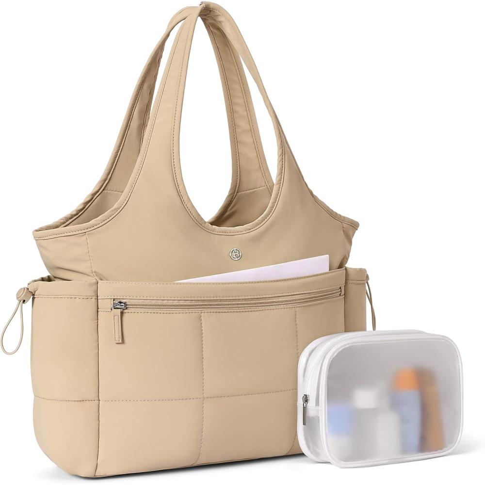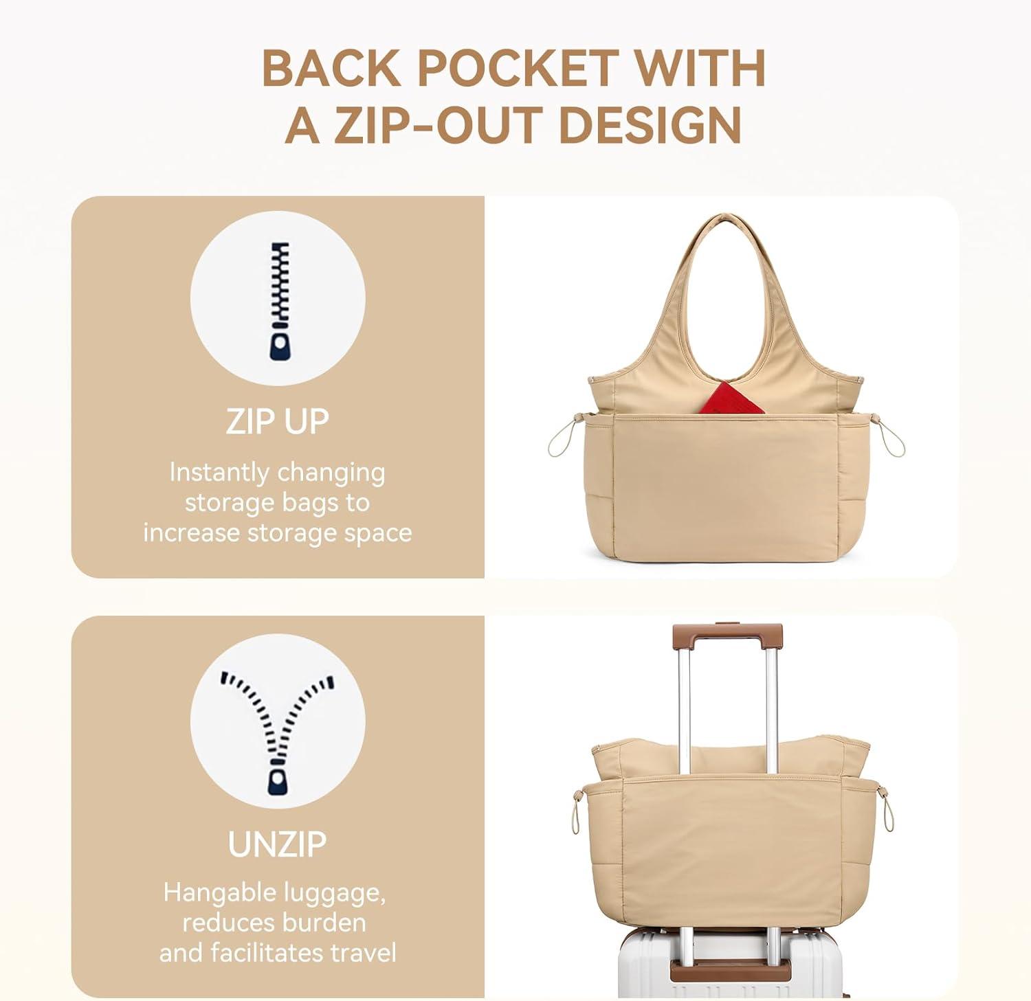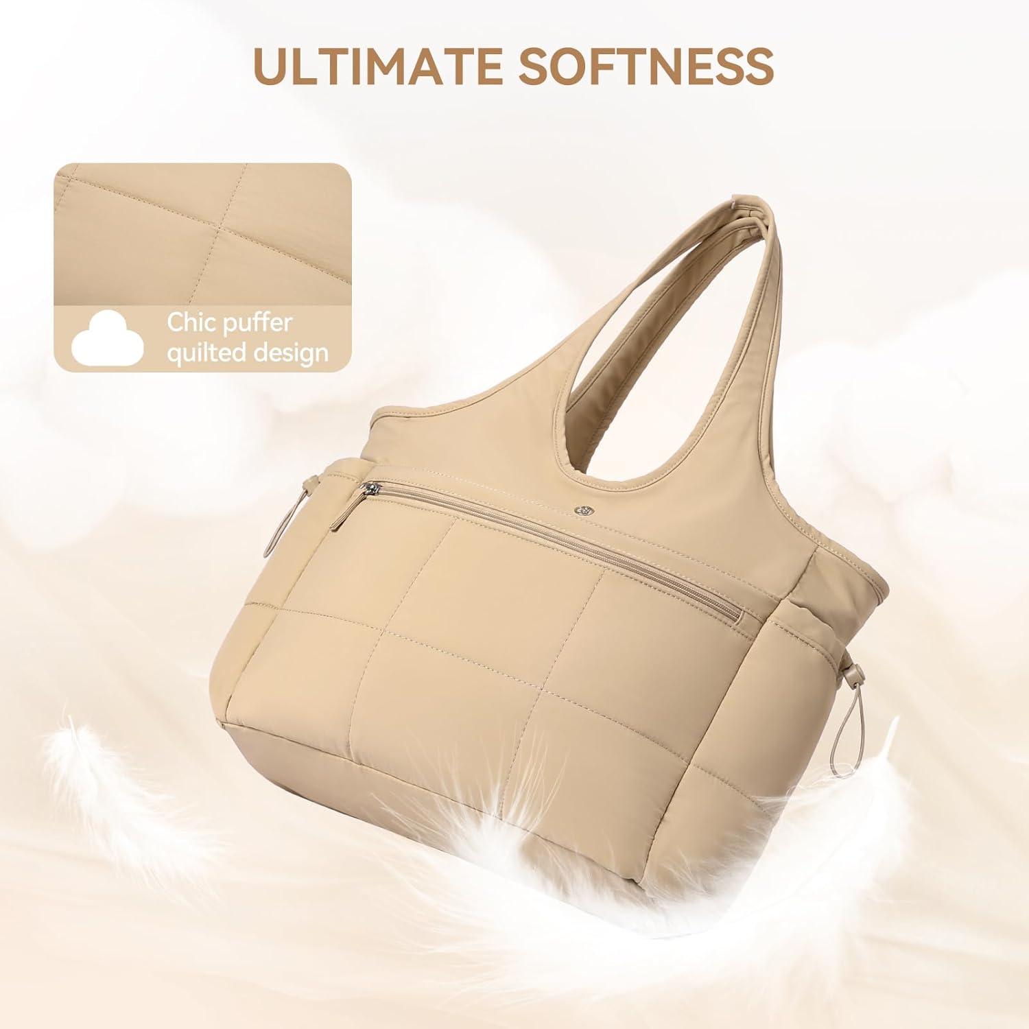 BOSTANTEN Puffer Tote Bag for Women Travel Tote Bag with Trolley Sleeve Lightweight Quilted Laptop Nurse Bag with Zipper(Khaki)