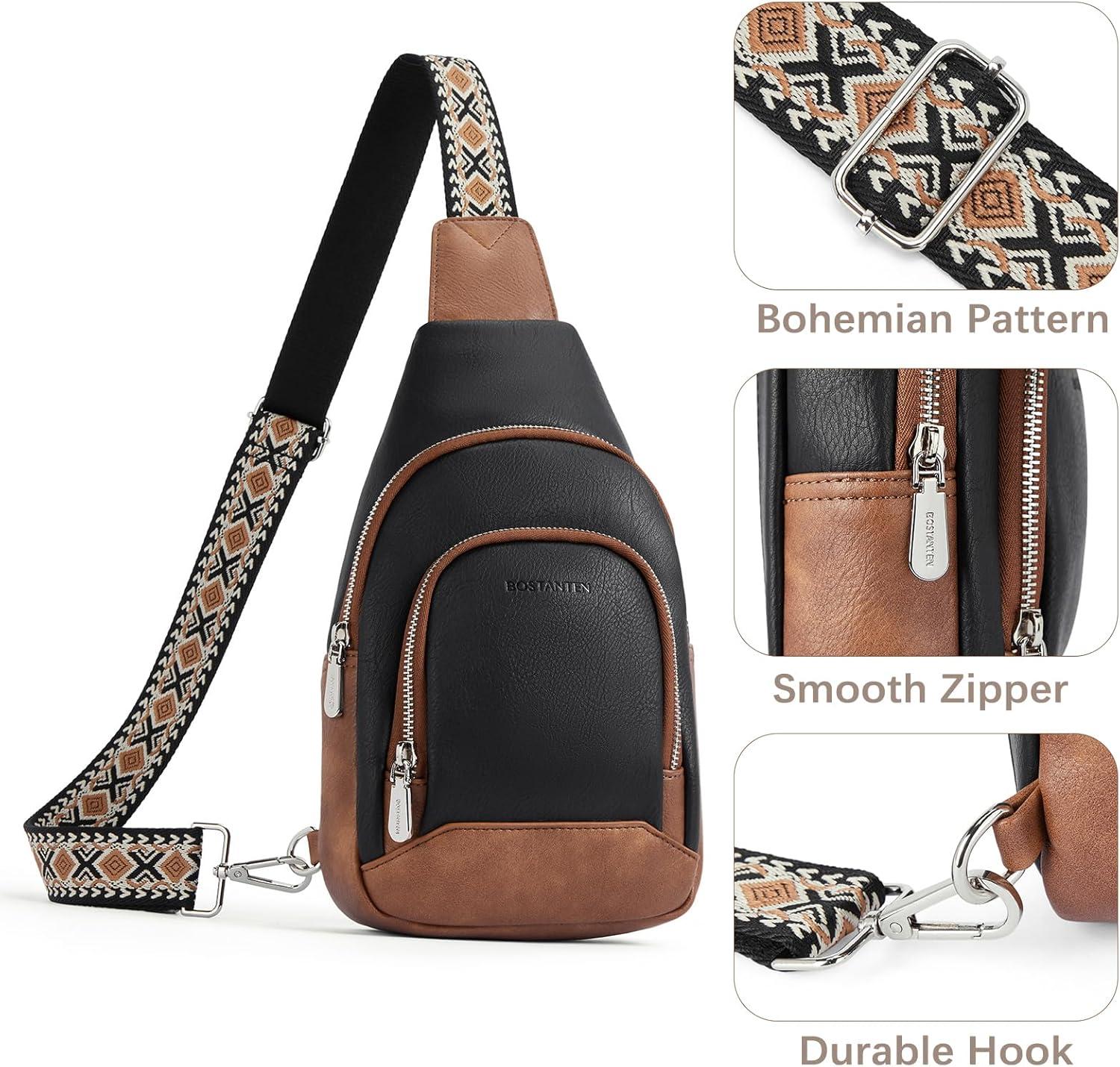 BOSTANTEN Sling Bag for Women Leather Crossbody Bag Vintage Cross Body Purse for Travel with Guitar Strap, Bohemian Style(Black&brown)