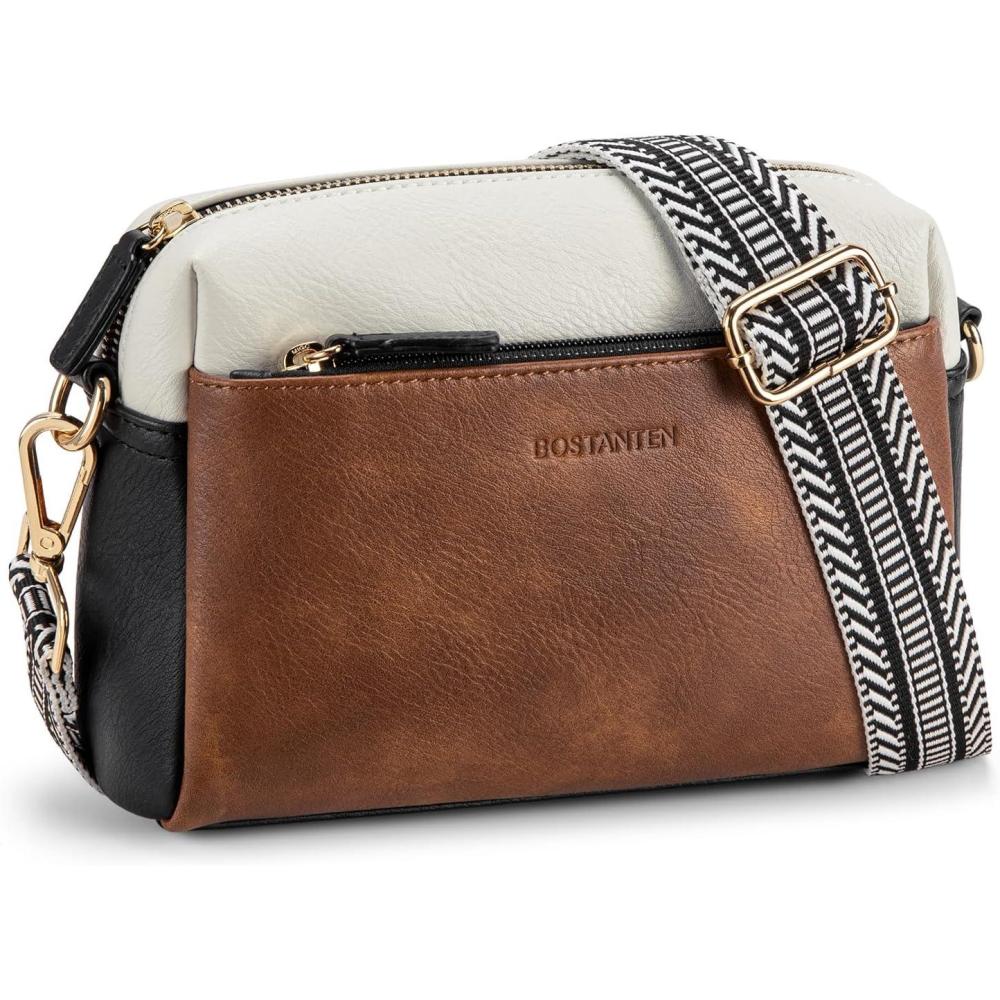 BOSTANTEN Small Crossbody Purse for Women Triple Zip Cell Phone Leather Handbag with Colored Shoulder Strap(P04-brown With Black)