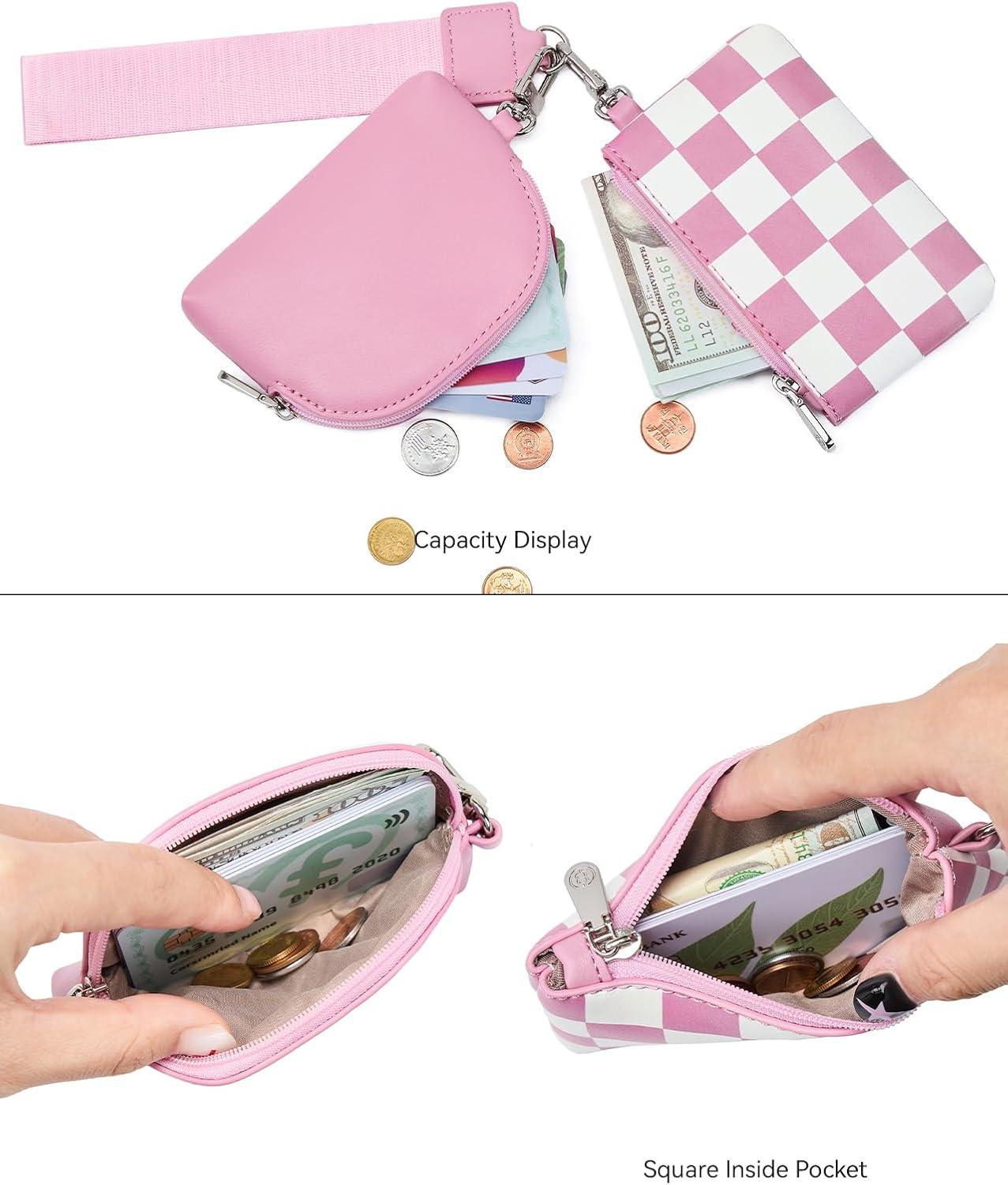 BOSTANTEN Small Wallet Checkered, Wristlet Wallets for Women RFID Detachable Dual Pouch Keychain Wristlet Wallet Cute Coin Purse, Black and White(A-Pink and White)