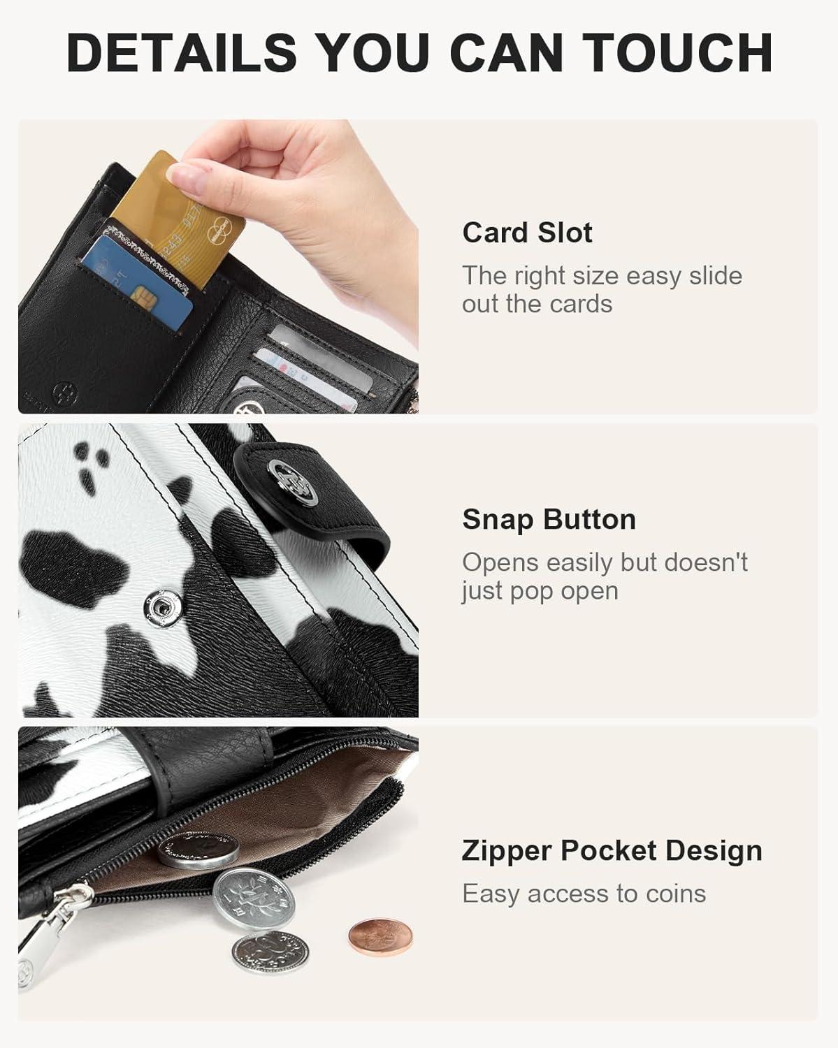 imageBOSTANTEN Small Wallet for Women Leather RFID Blocking Card Holder Bifold Compact Wallets With Zipper Coin Pocket BrownBeigeBlackWhite Cow Print