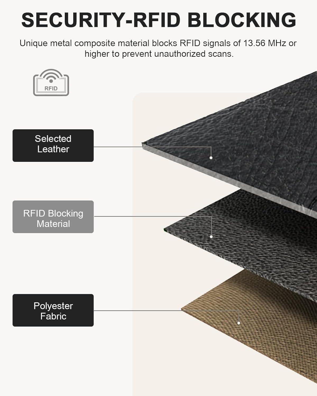Rfid Blocking & Protection: The leather small wallet feature proprietary blocking material, which will block any RFID signals and protect your valuable private information from remote unauthorized access, keeping your personal and credit card details safe when traveling or when shopping.