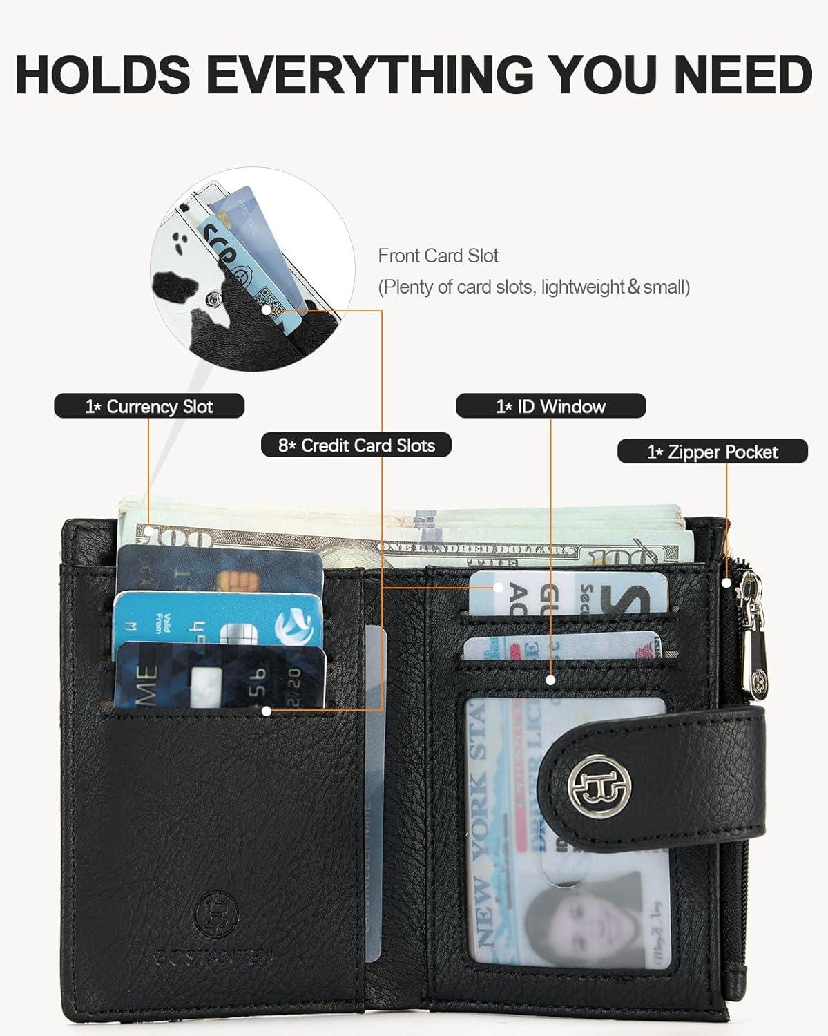 Practical Design: Leather bifold wallet comes with 8 credit card slots, 1 ID window, 1 currency slot, 1 zipper pocket for change. Roomy enough for fitting plenty of cards, change and some bills, coins, keep them well organized. Ladies wallet's card slot has been tested many times and is easy to get your cards in and out. The zipper of the RFID wallet women has been tested several times and must be smooth and not stuck.