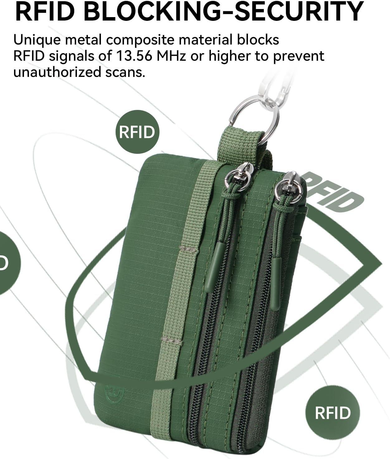 Pocket-Sized and Spacious: Small wallet size 4.13'' x 3.5'' x 0.39'', long lanyard size 20.07'' x 0.47''. With 3 zippered compartments, 1 separate ID window and 1 separate card slot are suitable for sorting and holding cash and cards, some coins, keys as well. The lanyard is long enough to be easily pulled out and used. You can also pin the RFID wallet to the bag, which helps stop pickpockets and ensures that the items are safely placed back into the travel wallet.