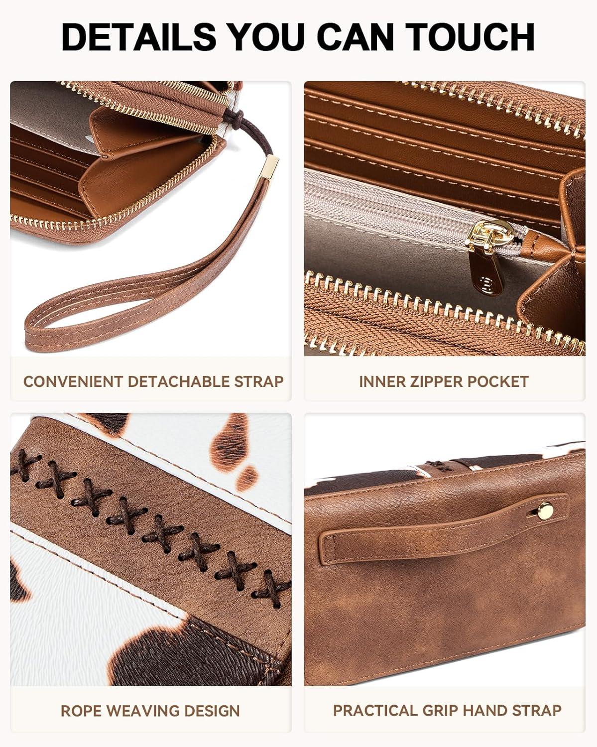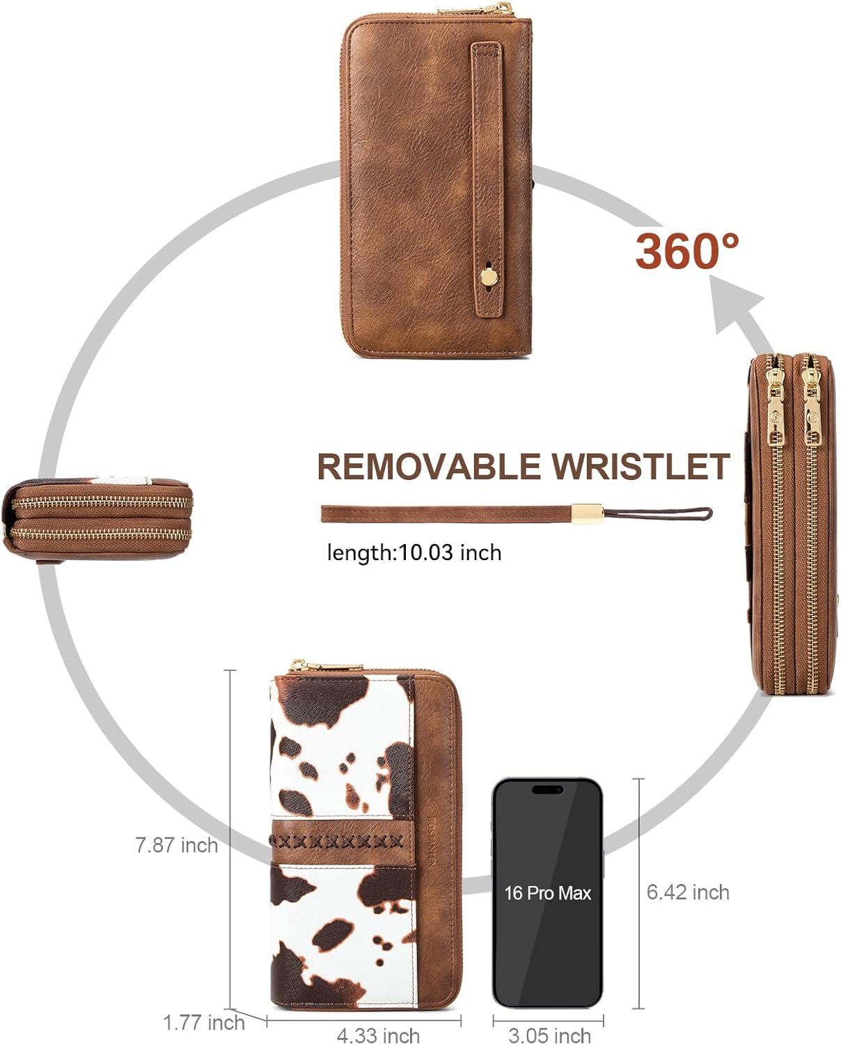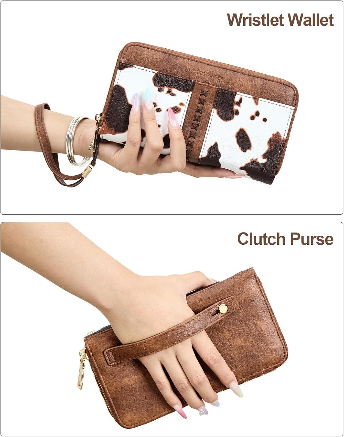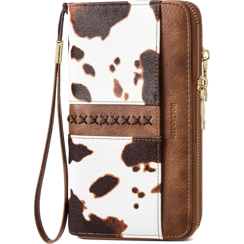 BOSTANTEN Wallets for Women Leather RFID Double Zipper Around Credit Card Holder Large Capacity Wristlet Clutch Wallet(Brown Cow Print)