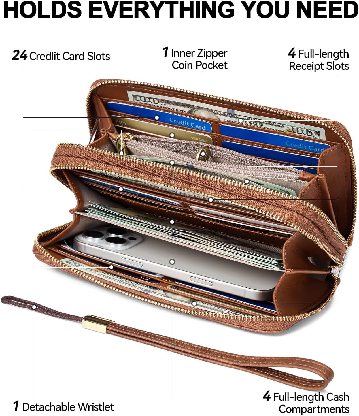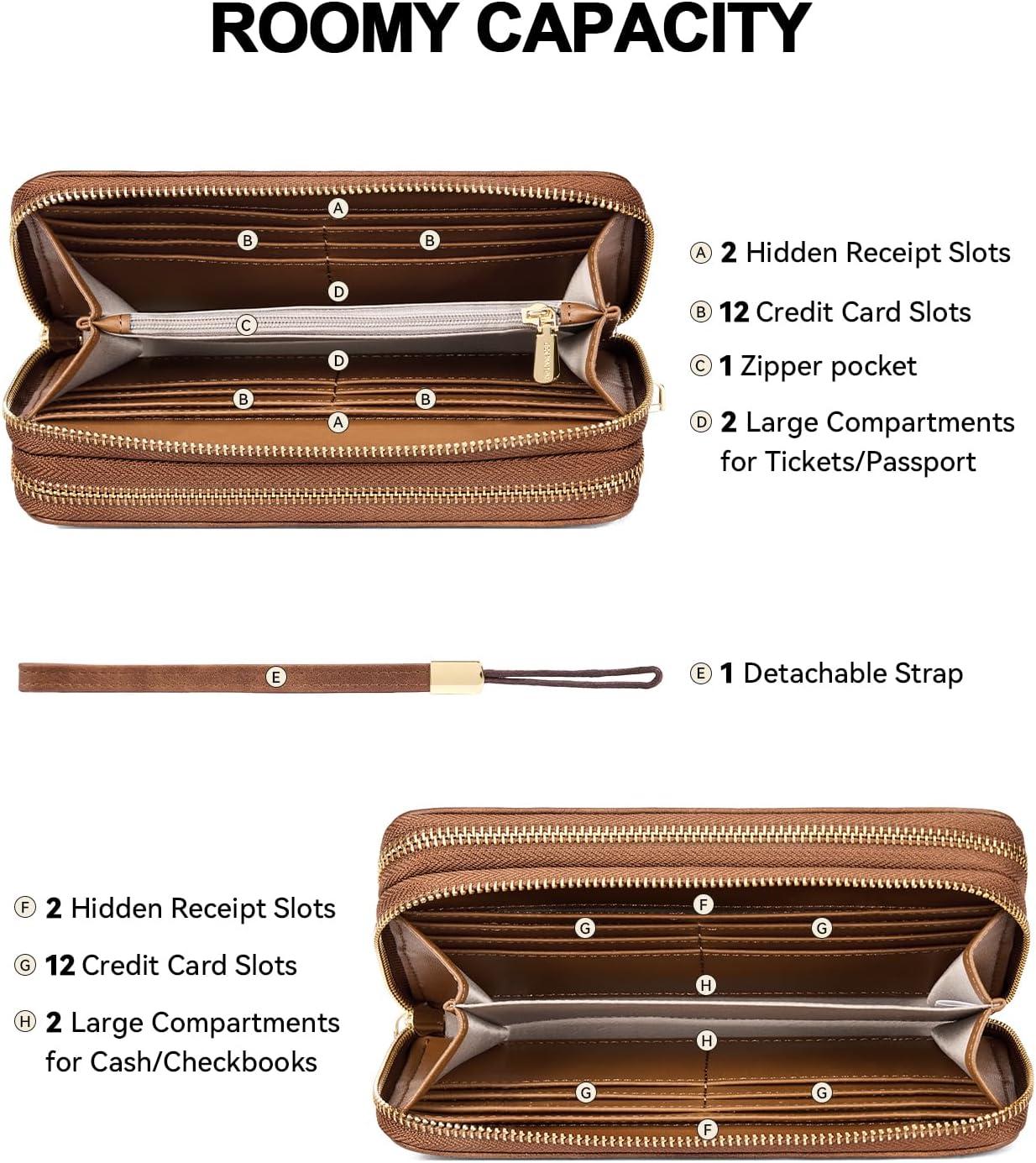 BOSTANTEN Wallets for Women Leather RFID Double Zipper Around Credit Card Holder Large Capacity Wristlet Clutch Wallet(Brown)
