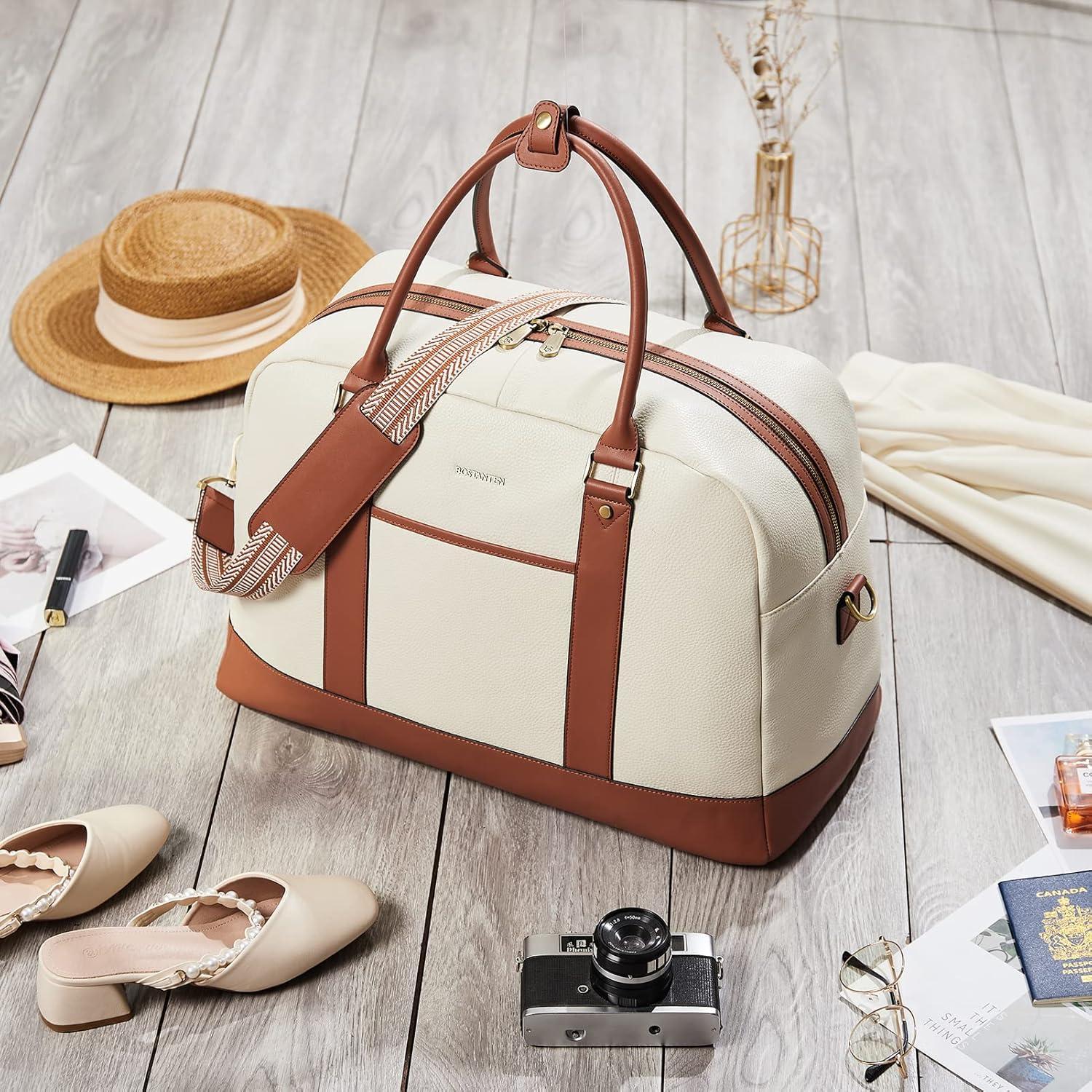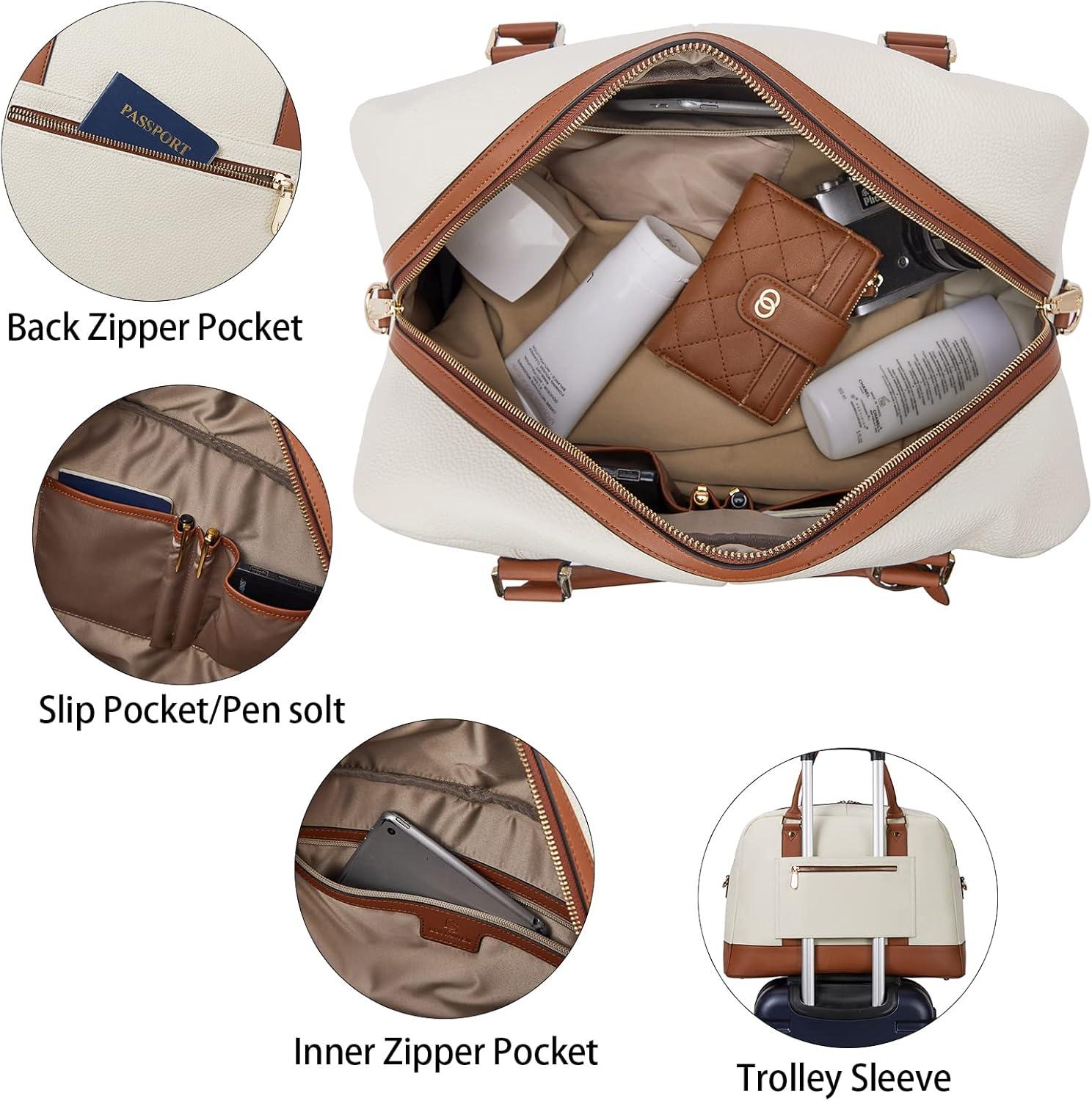 BOSTANTEN Weekender Bags for Women Leather Travel Duffle Bag Carry On Large Tote Duffel with Shoe Compartment and Trolley Sleeve(A-Beige&Brown)