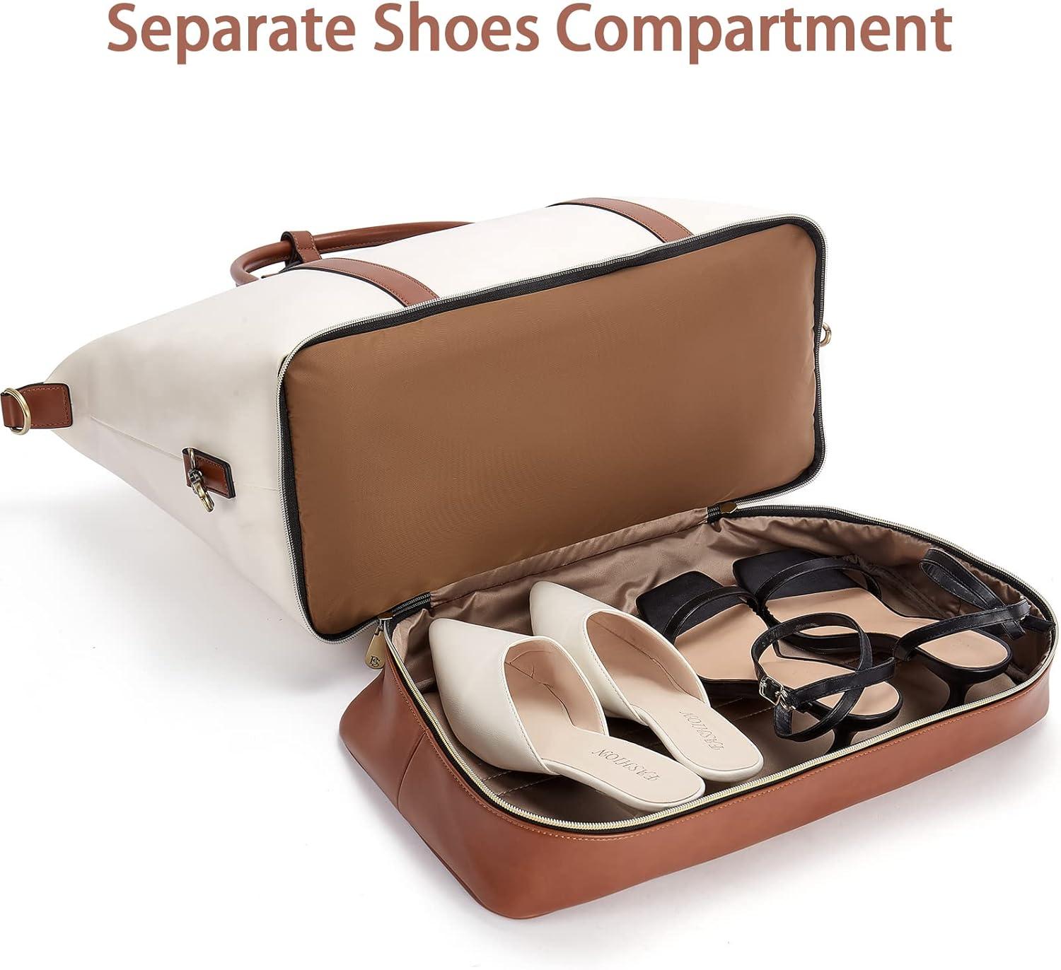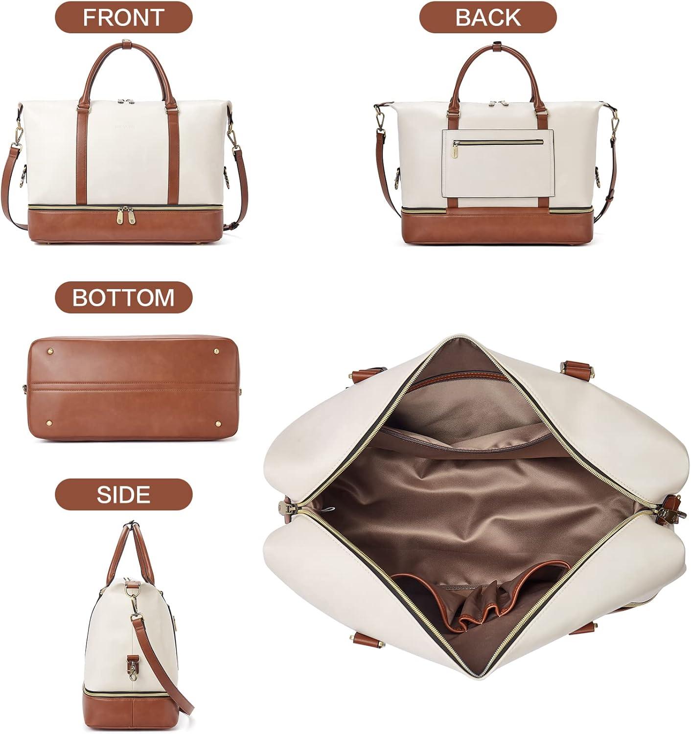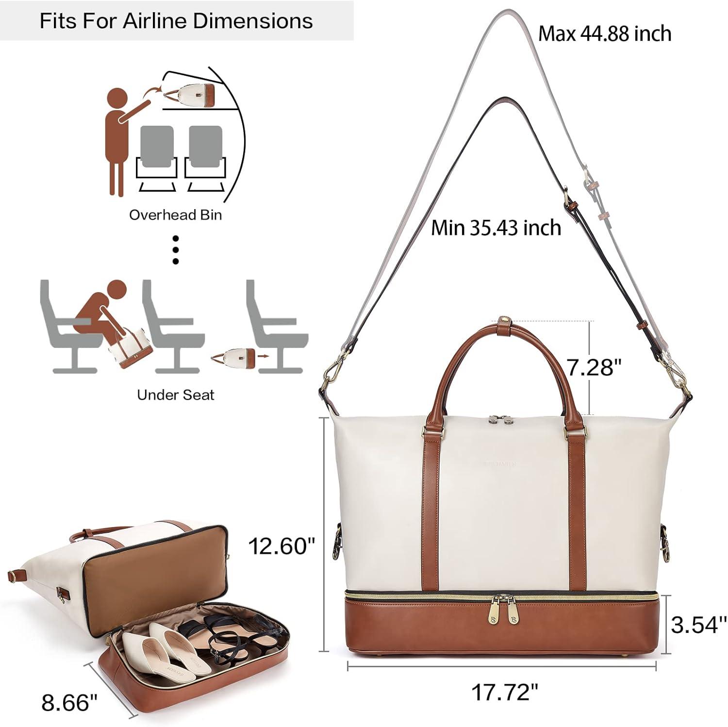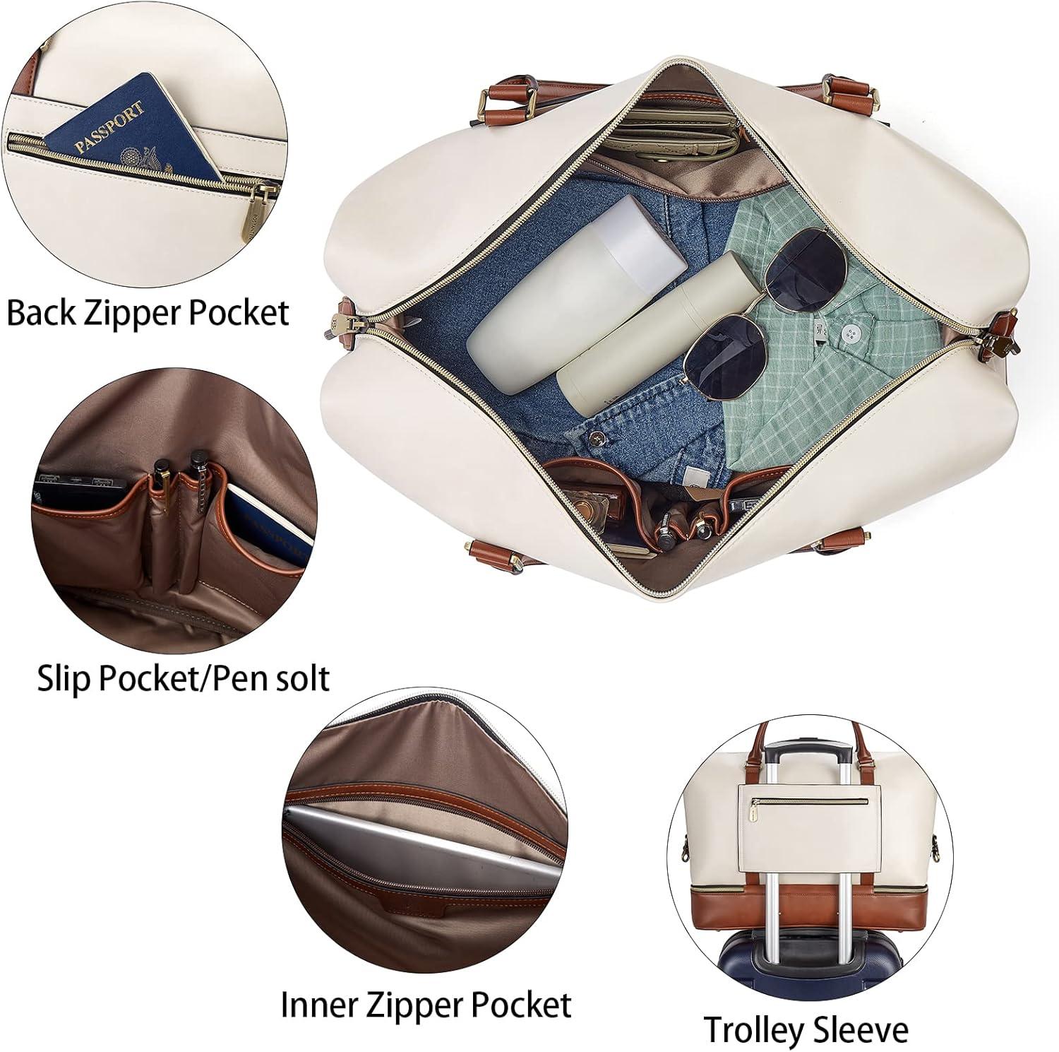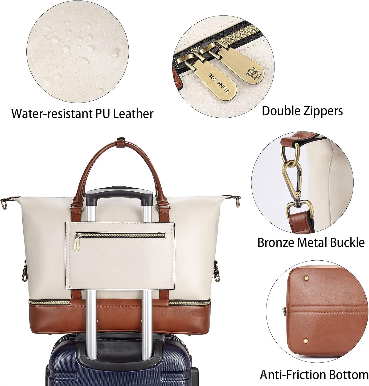 Premium Material — This weekender bag for women is handmade by professional craftsman with high quality water-resistant pu leather, soft khaki fabric lining,and vintage bronze hardware.Well-knit stitch make it bear heavier weight stuff without tearing.Stylish but also durable as long as the time you use it
