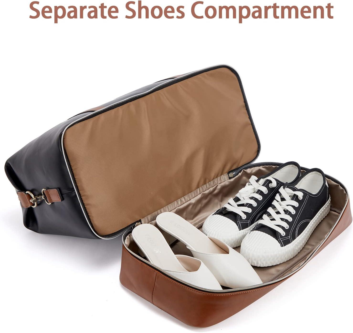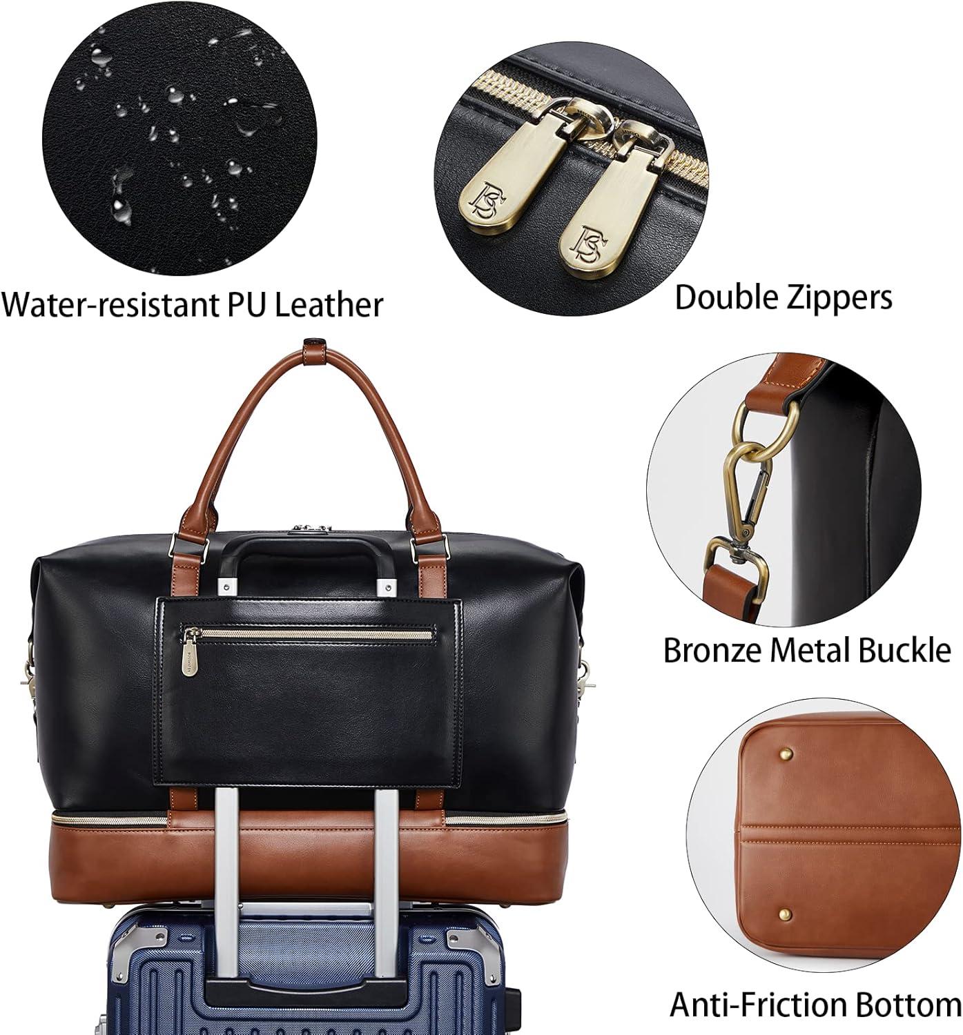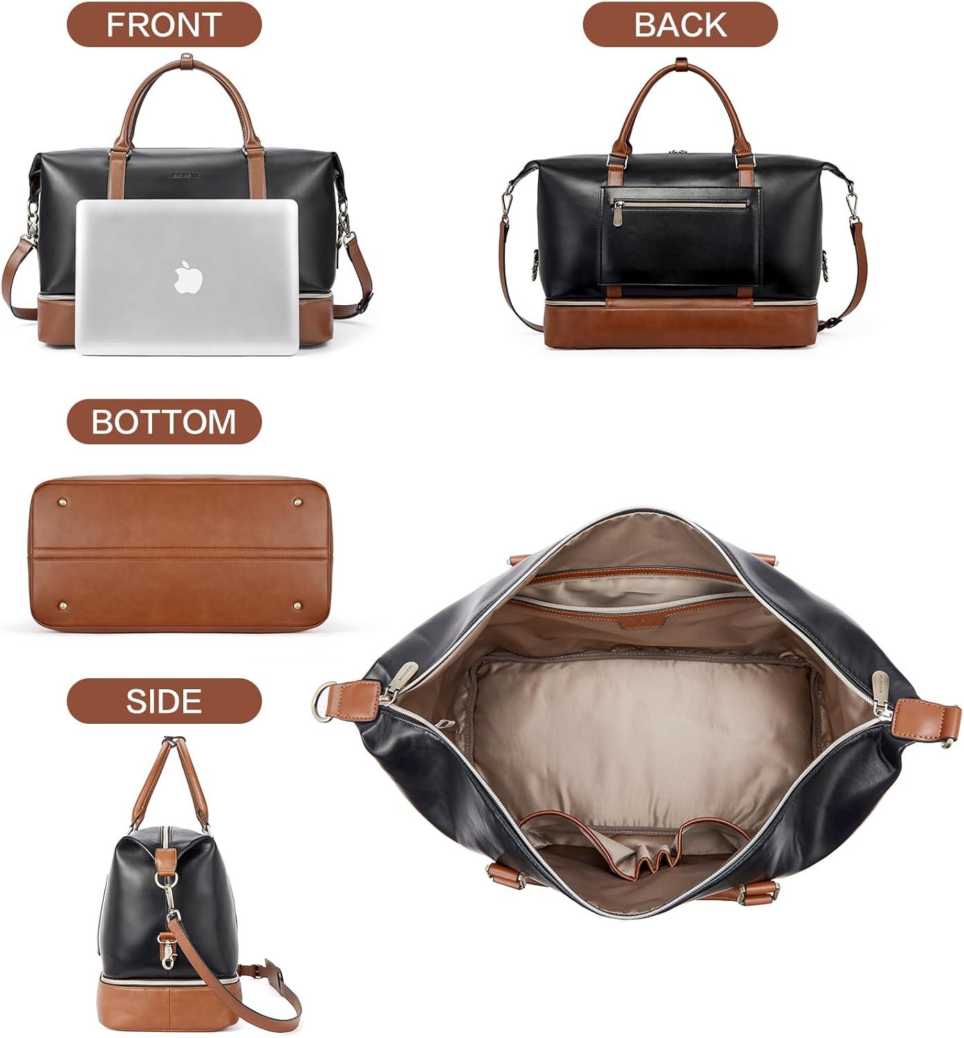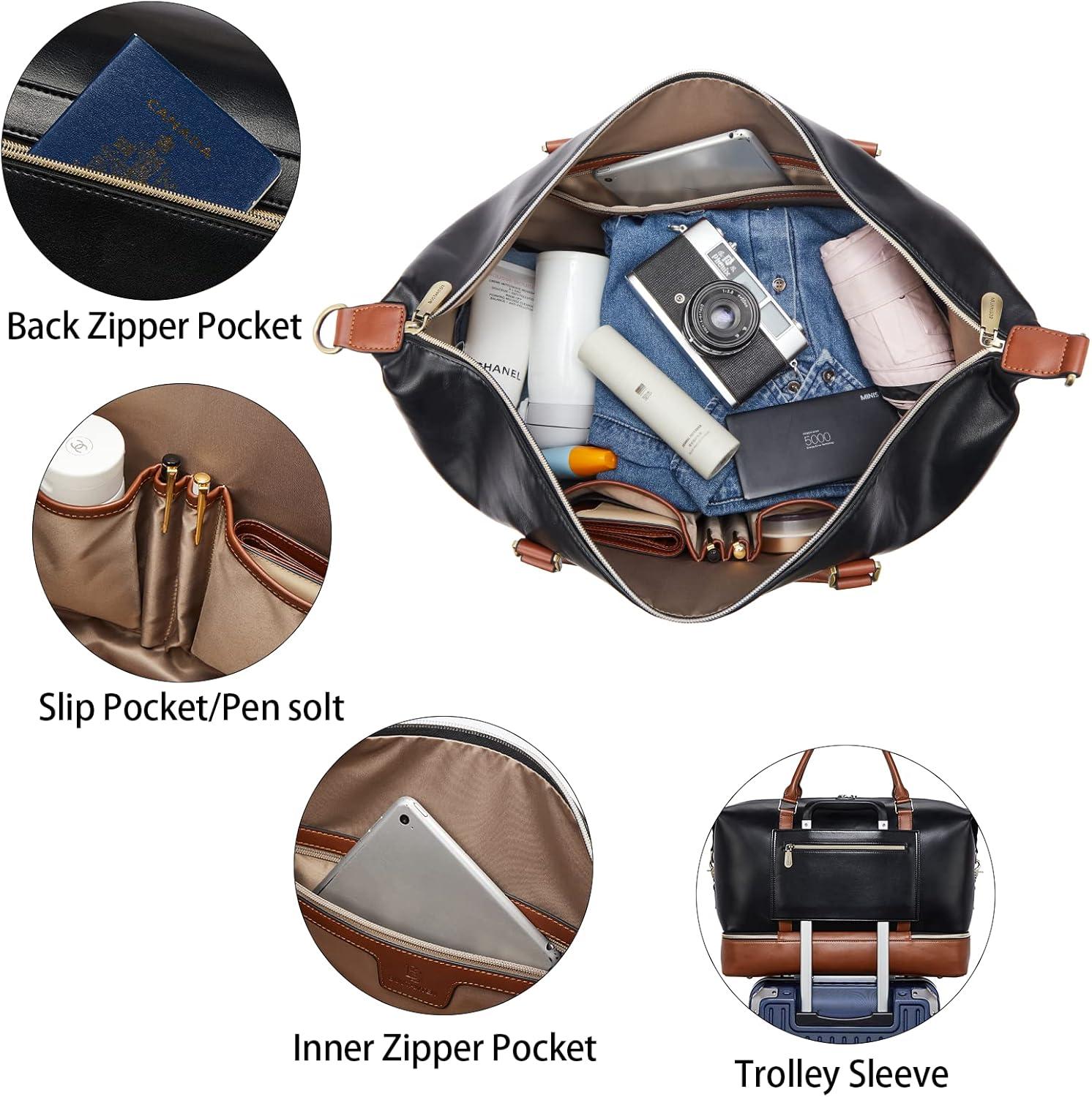 Premium Material — This weekender bag for women is handmade by professional craftsman with high quality water-resistant pu leather, soft khaki fabric lining,and vintage bronze hardware.Well-knit stitch make it bear heavier weight stuff without tearing.Stylish but also durable as long as the time you use it.