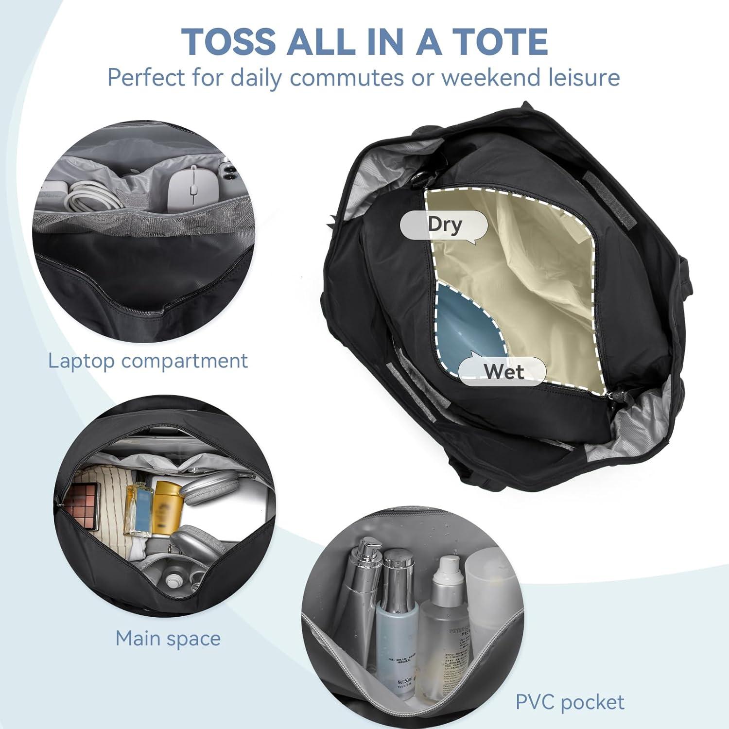 Gym Bag with Shoe Compartment: The shoe compartment dimension is 18.7''(L)*8.86''(W)*3.96″(H), wipes pocket could hold your dirty clothes or shoes that need to be changed for wash after traveling or exercising for easy separation from clean stuff when traveling. The soft water-resistant lining and air vents help to prevent smell and leakage, keeping the interior of the wipes dispenserclean and hygienic. It's a good choice as a sports duffel bags, yoga bag, dance bag