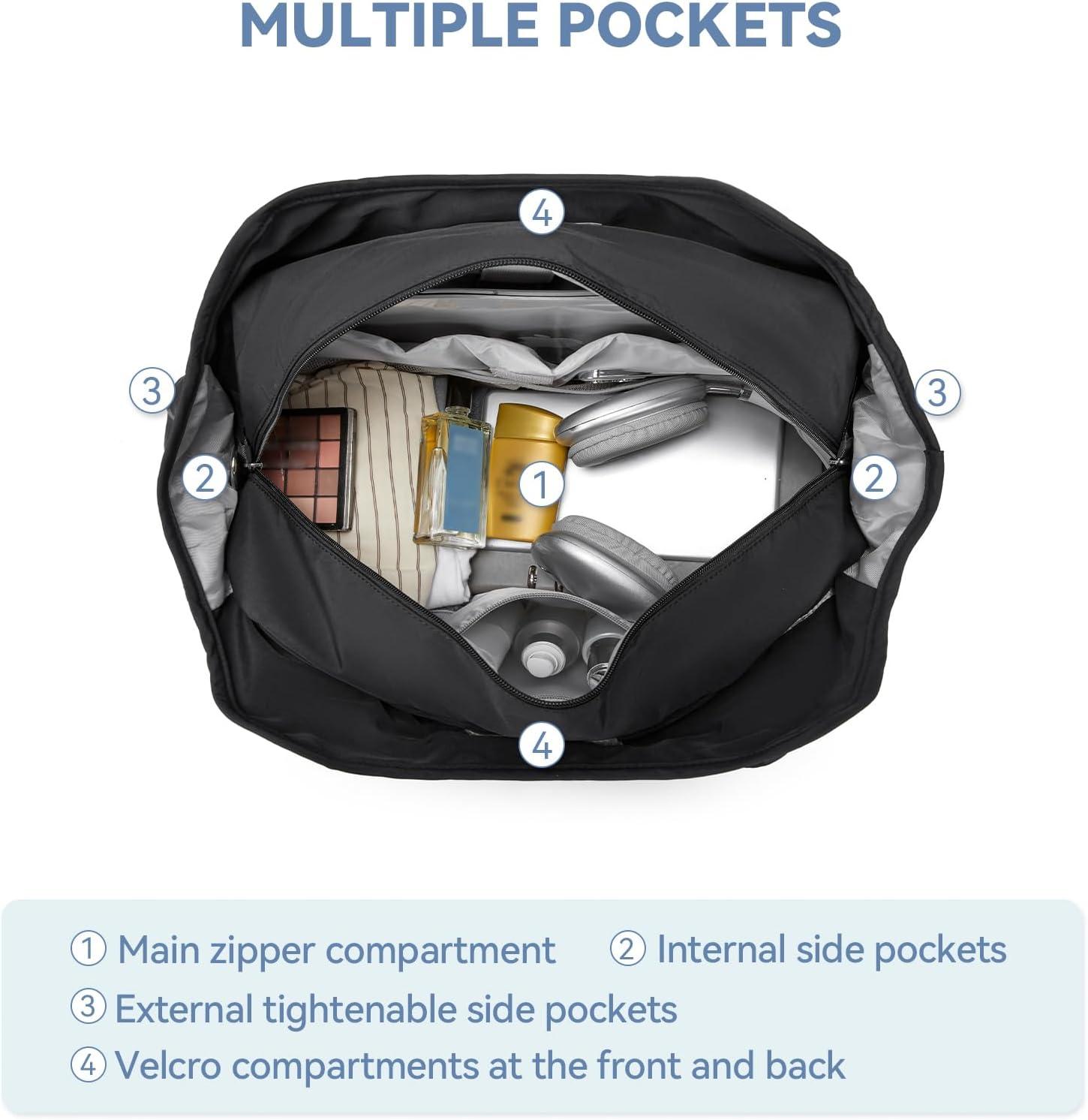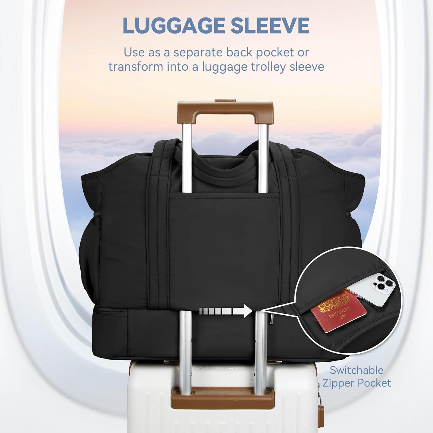Weekender Bag with Shoe Compartment –The shoe compartment dimension is 21.65''(L)*12.99''(W)*7″(H), which could hold your shoes or dirty clothes for easy separation from clean stuff when traveling.The soft water-resistant lining and air vents help to prevent smell and leakage, keeping the interior of the bag clean and hygienic