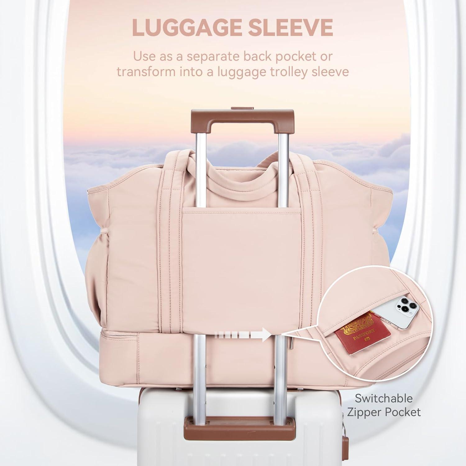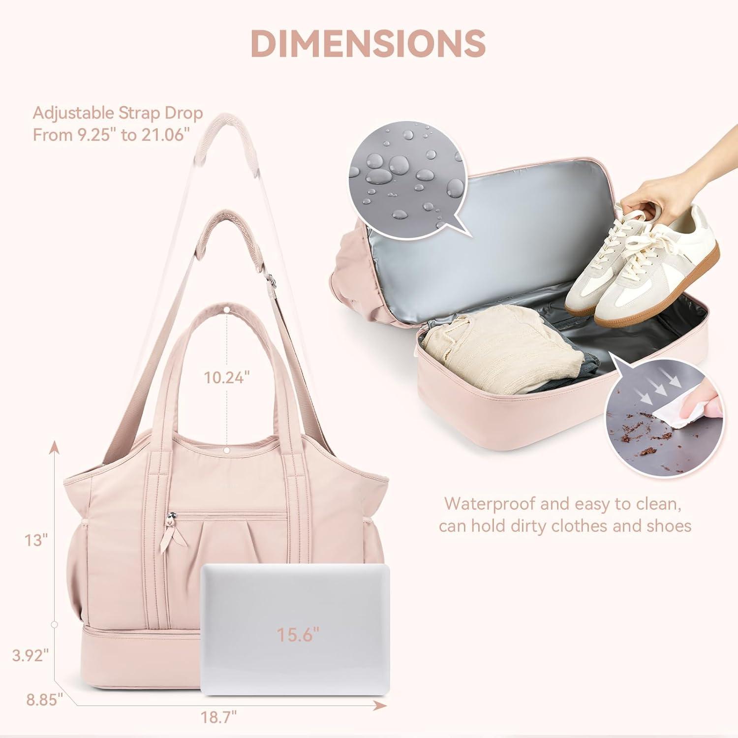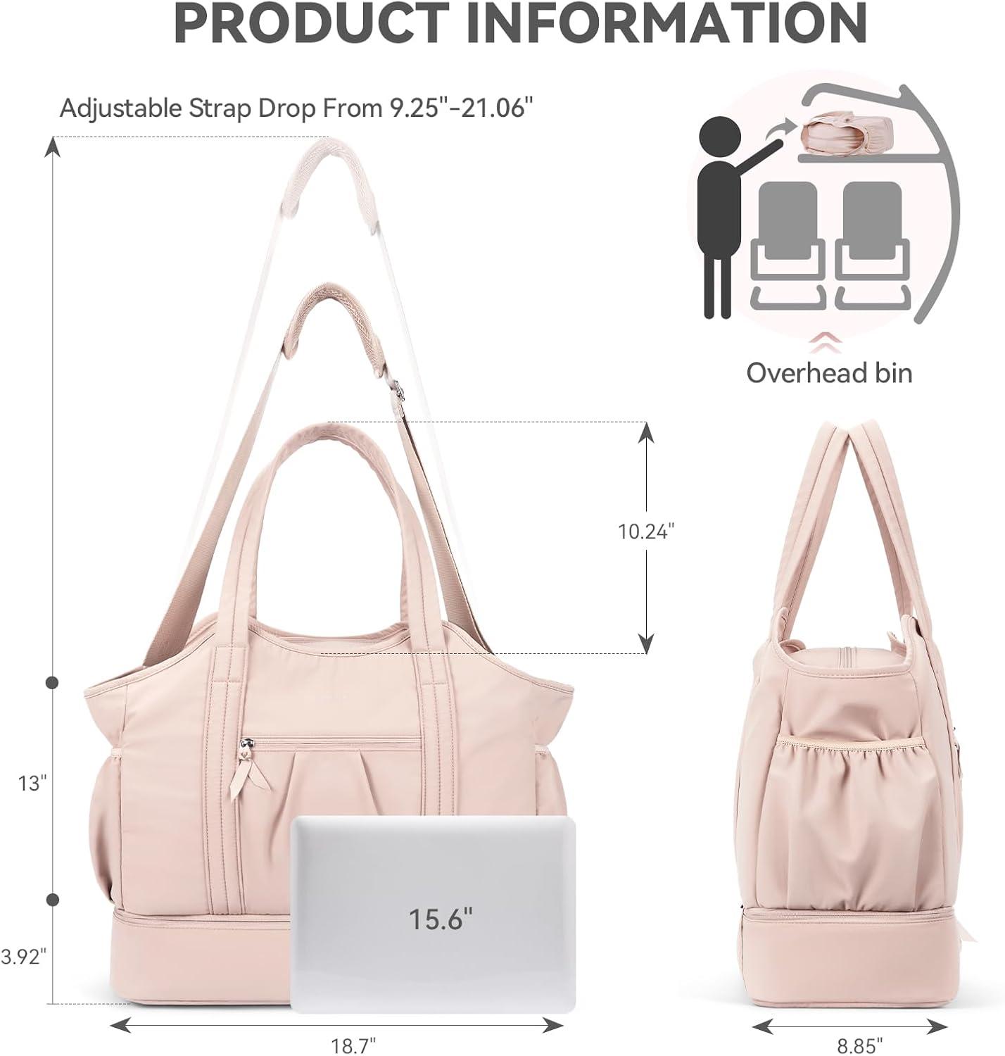 Weekender Bag with Shoe Compartment –The shoe compartment dimension is 21.65''(L)*12.99''(W)*7″(H), which could hold your shoes or dirty clothes for easy separation from clean stuff when traveling.The soft water-resistant lining and air vents help to prevent smell and leakage, keeping the interior of the bag clean and hygienic