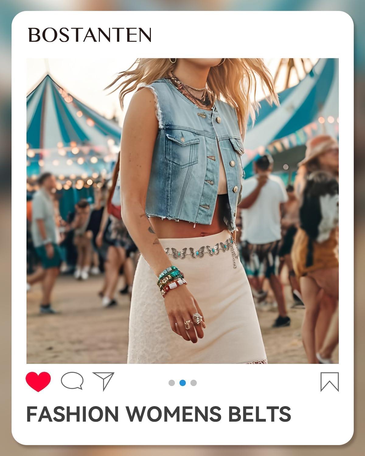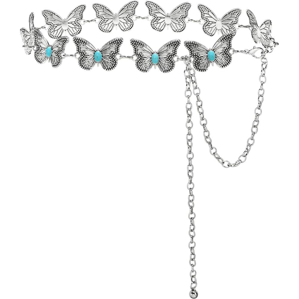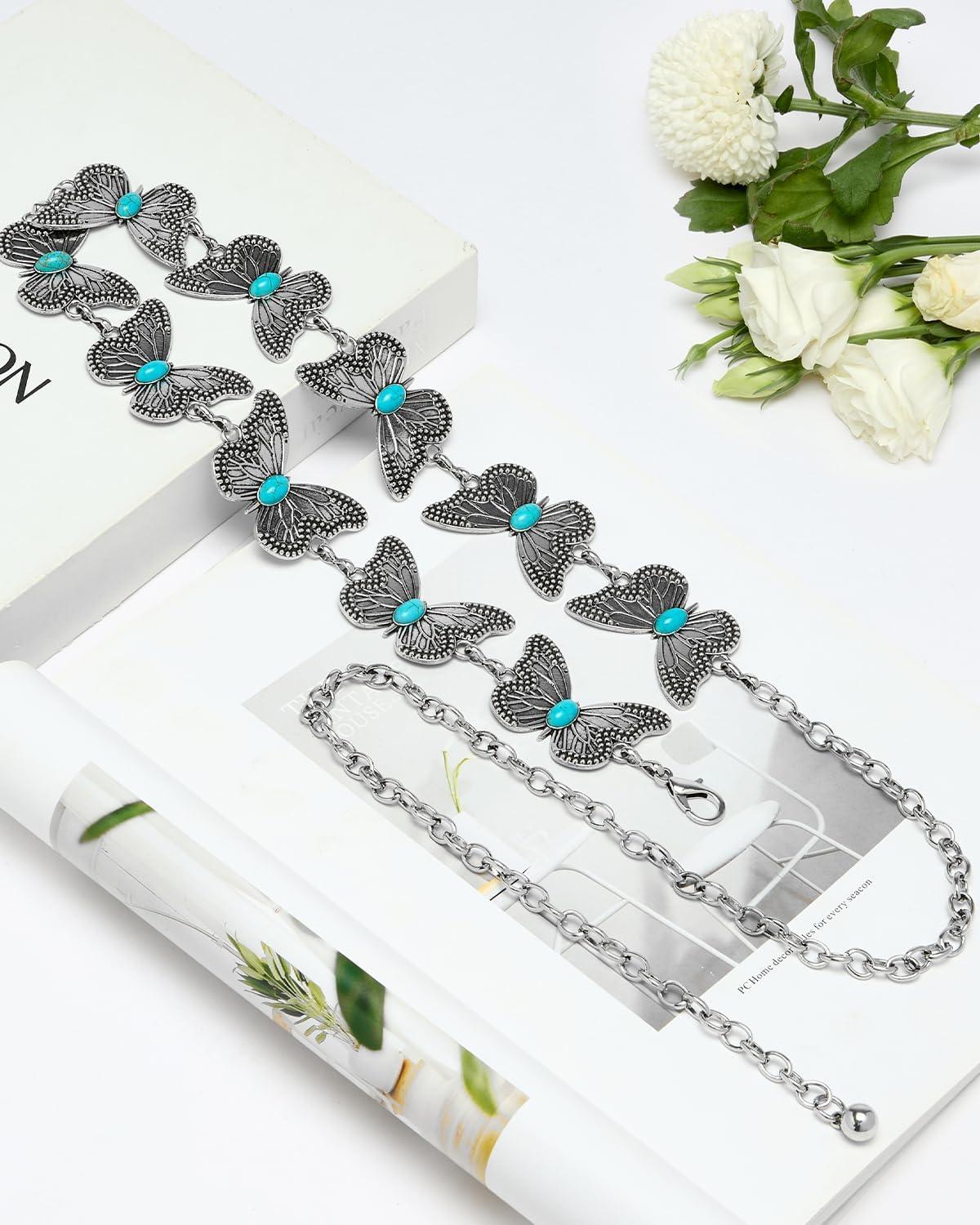 BOSTANTEN Western Metal Waist Chain Belt for Women Cowgirl Boho Turquoise Belts for Dress Jeans Country Concert Outfit(002-butterfly Vintage Silver)