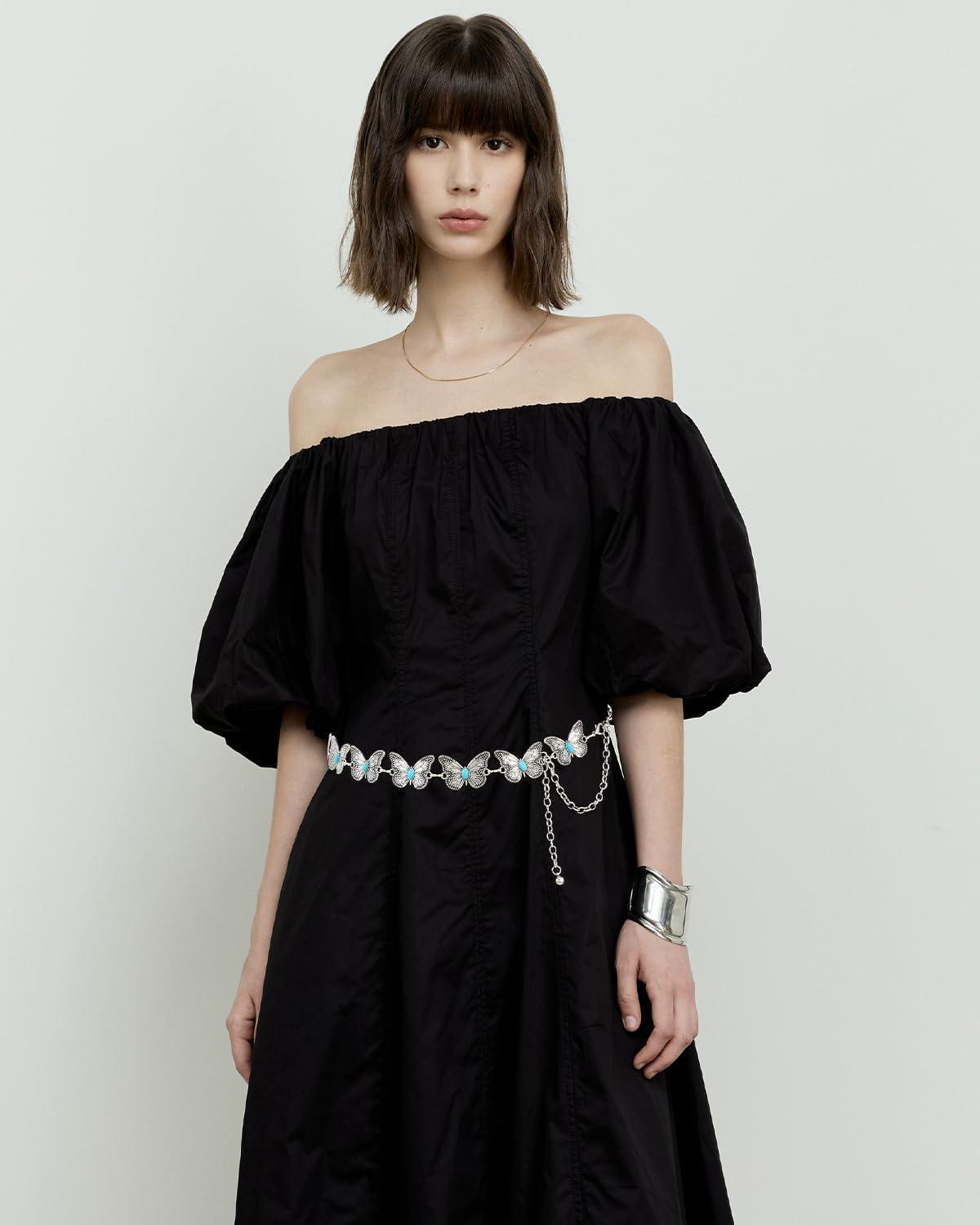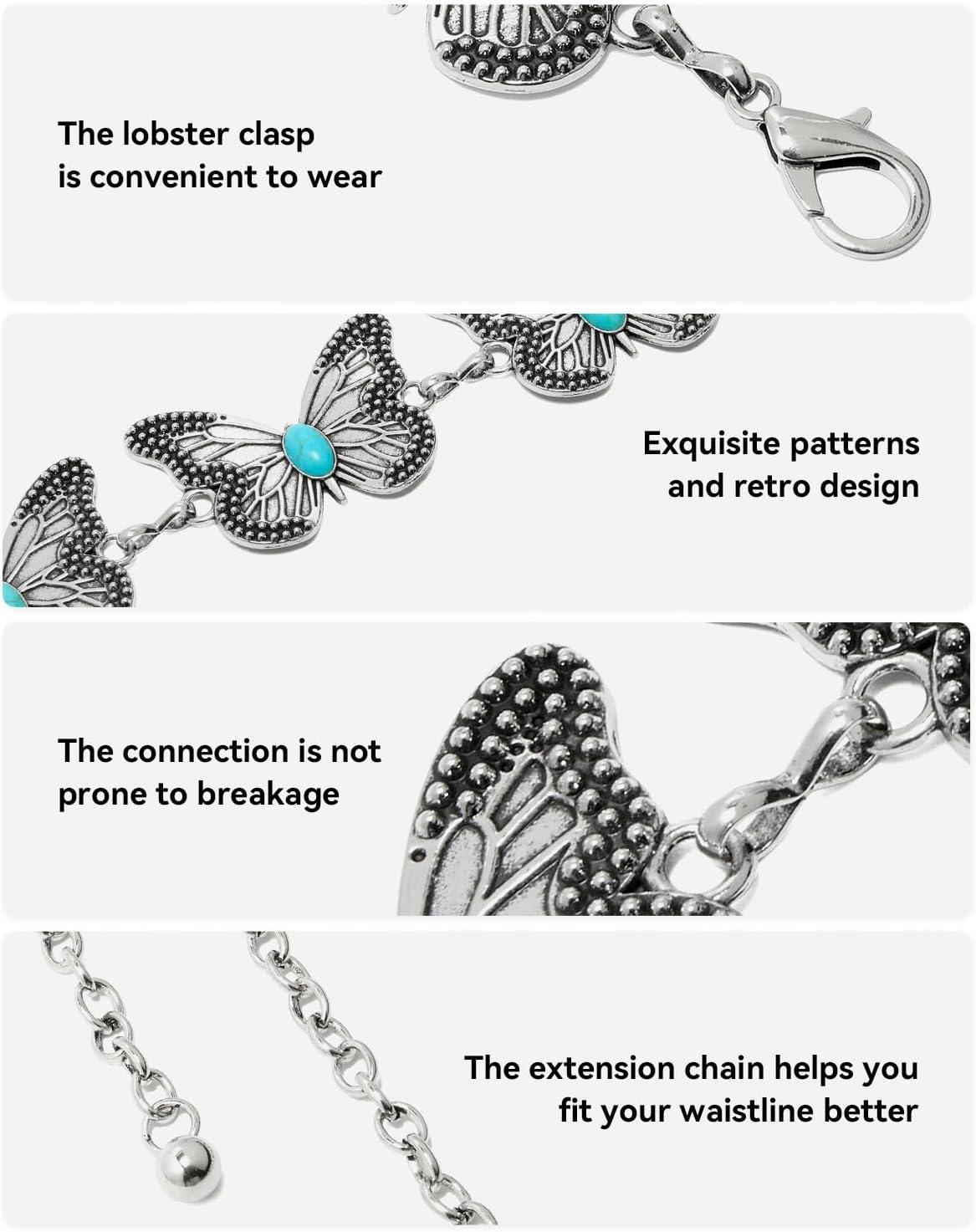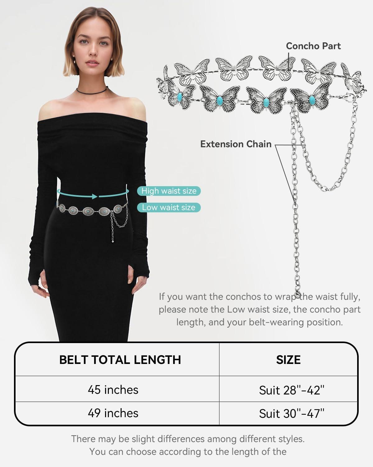 BOSTANTEN Western Metal Waist Chain Belt for Women Cowgirl Boho Turquoise Belts for Dress Jeans Country Concert Outfit(002-butterfly Vintage Silver)