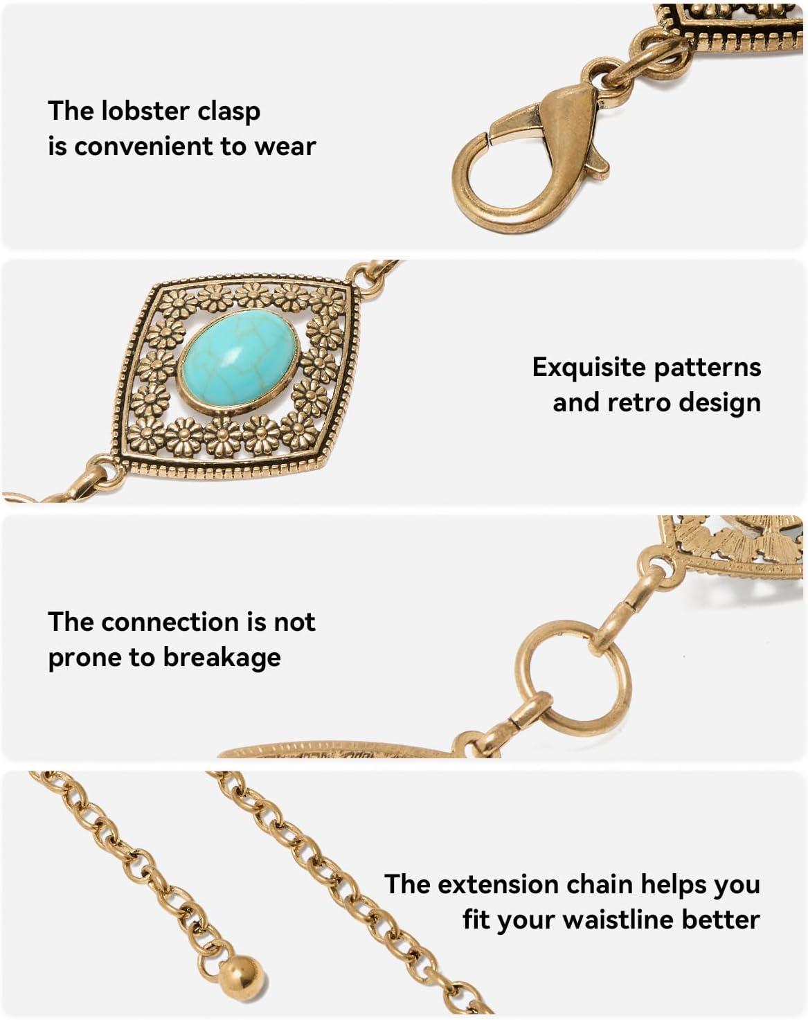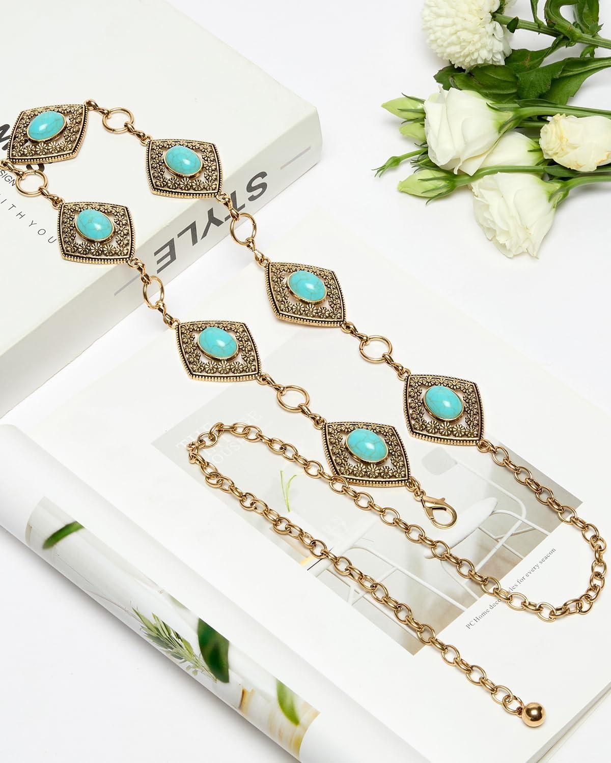BOSTANTEN Western Metal Waist Chain Belt for Women Cowgirl Boho Turquoise Belts for Dress Jeans Country Concert Outfit(003-diamond Vintage Goldr)