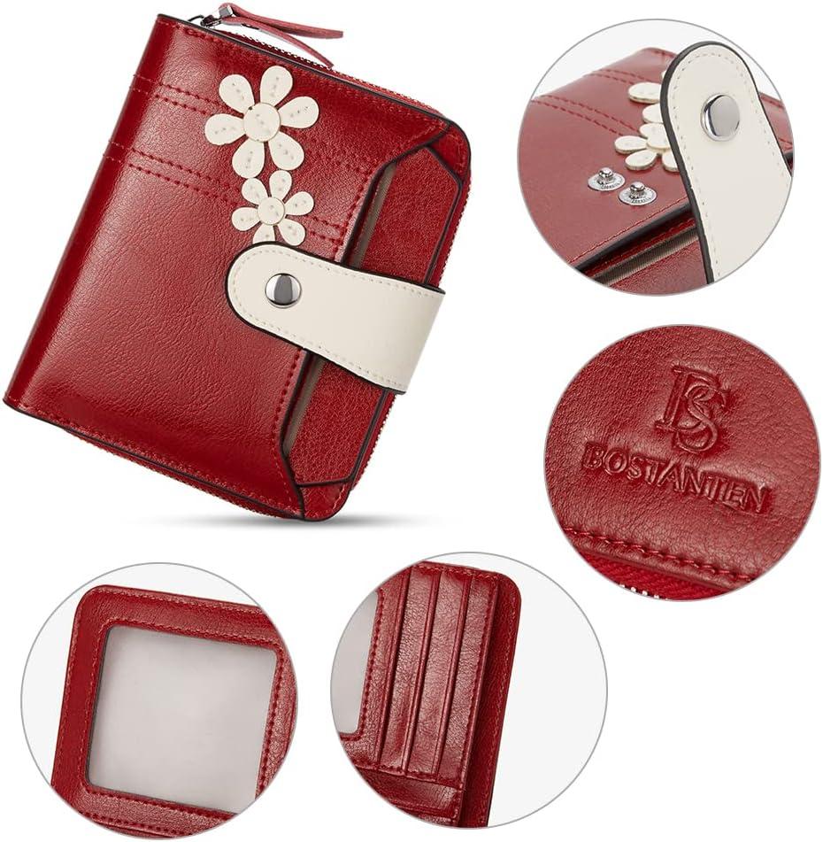 BOSTANTEN Women Leather Wallet Small RFID Blocking Bifold Zipper Pocket Wallet Card Case with ID Window Black&Beige(3-floral Red)