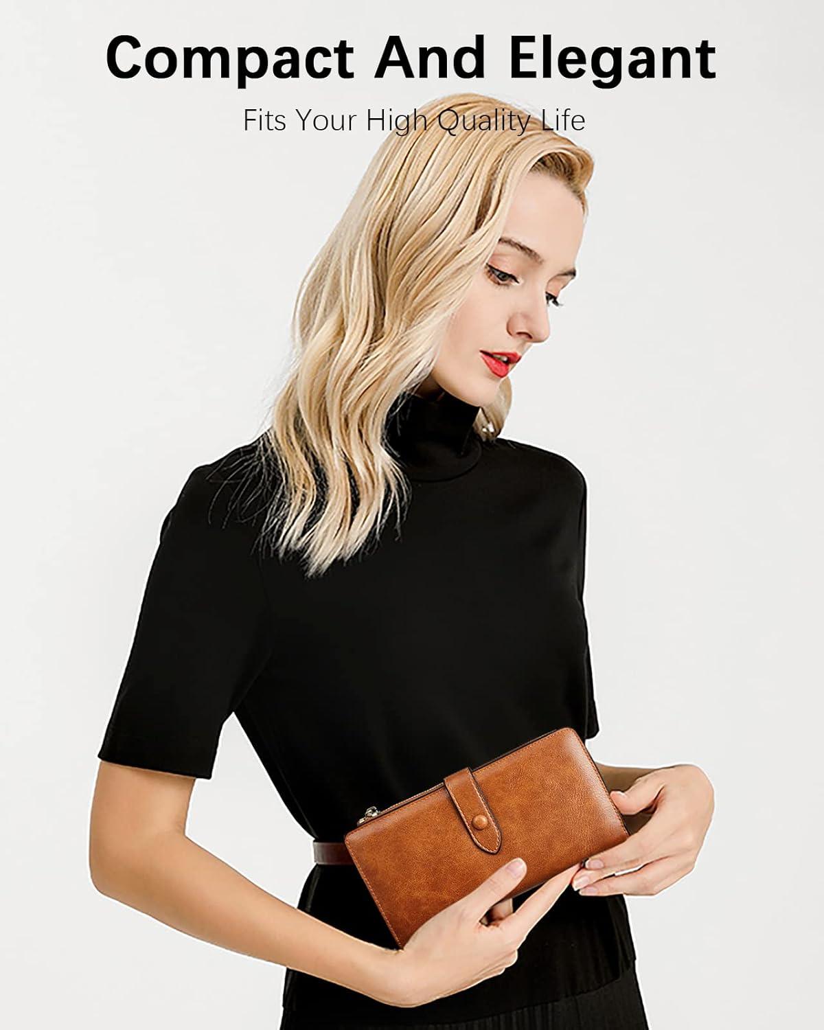 BOSTANTEN Womens Leather Wallets RFID Blocking Large Capacity Trifold Card Holder Ladies Phone Clutch Brown(B-Black-oil wax)