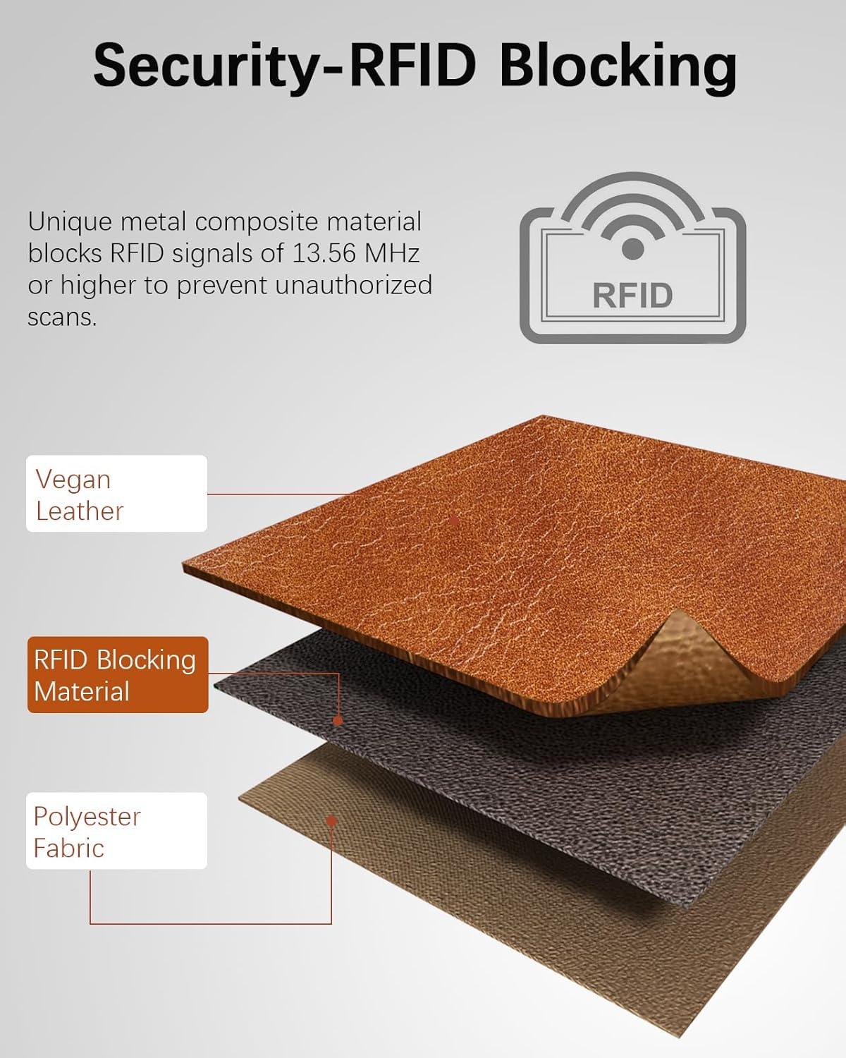 Rfid Blocking Wallet: Our wallets are equipped with advanced RFID SECURE Technology, a unique metal composite, engineered specifically to block 13.56 MHz or higher RFID signals and protect the valuable information stored on RFID chips from unauthorized scans.
