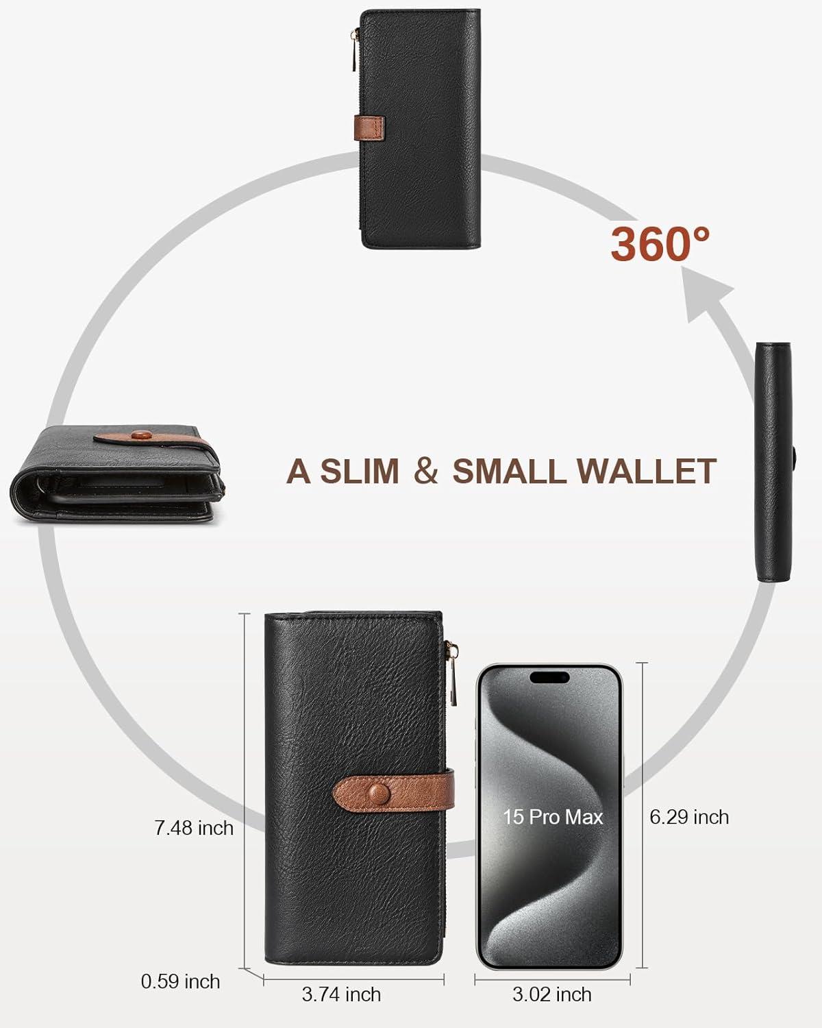 Functional Design: Snap Closure. Measure 7.48″ x 3.74″ x 0.59″ inches. Weight 0.26pounds/0.12kg. Comes With 16 Credit card slots and 4 ID windows, 4 full-length Bill compartment to put money, 1 zipper pocket. Roomy enough for fitting plenty of cards, change and some bills, coins, keeping them well organized.