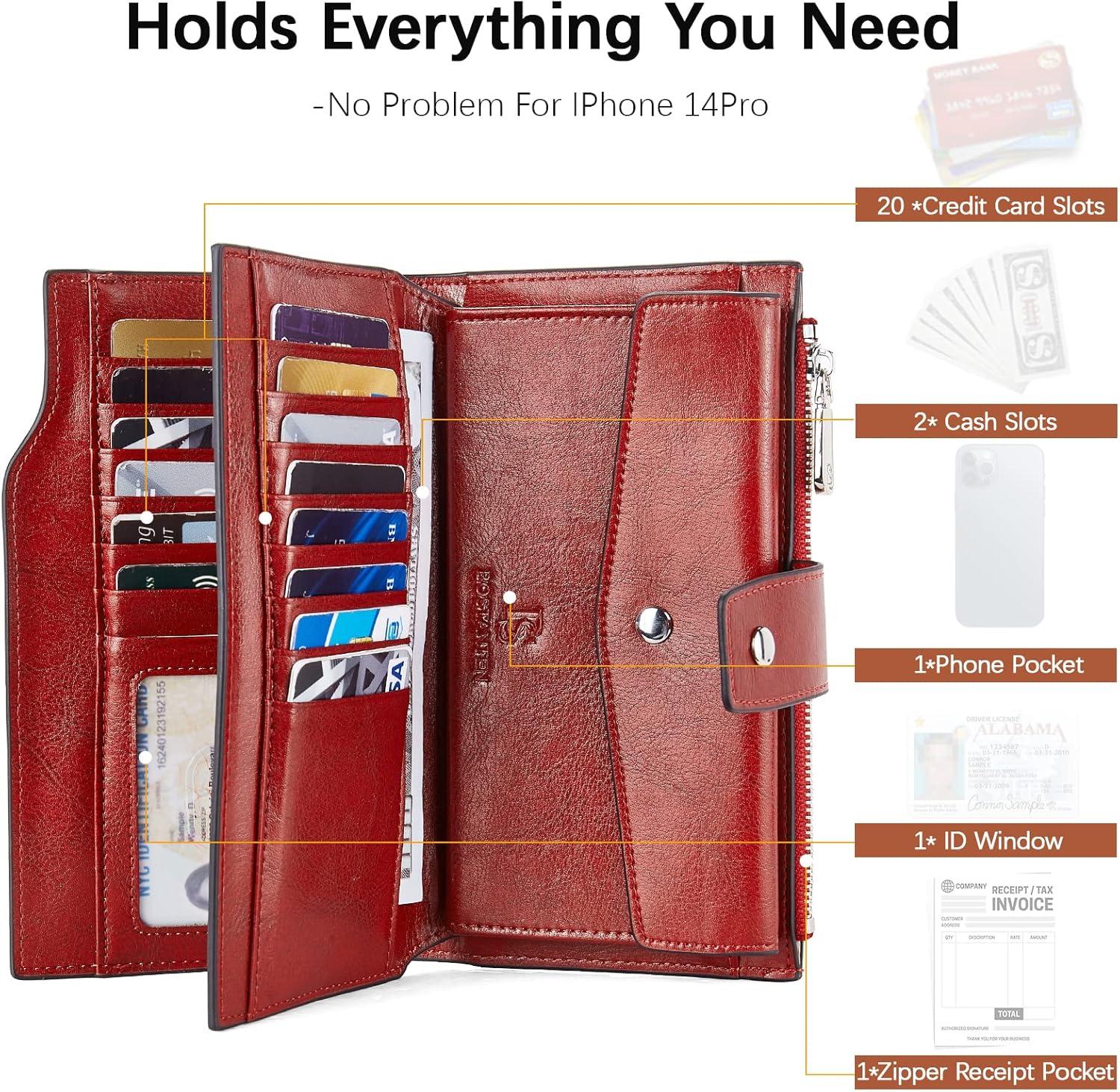 BOSTANTEN Womens Leather Wallets RFID Blocking Large Capacity Trifold Card Holder Ladies Phone Clutch Brown(C-Rose Red)