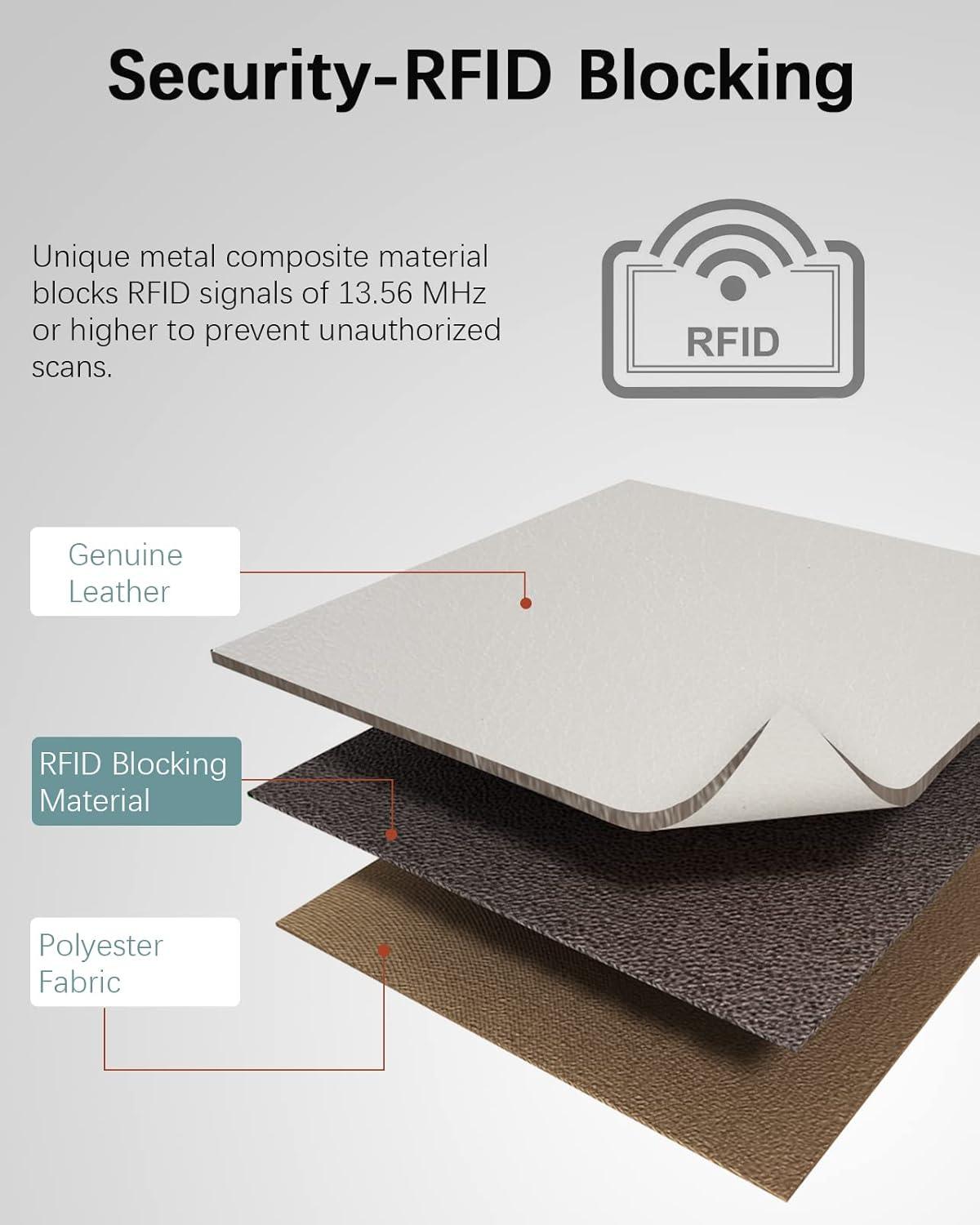 Rfid Blocking Wallet: Our wallets are equipped with advanced RFID SECURE Technology, a unique metal composite, engineered specifically to block 13.56 MHz or higher RFID signals and protect the valuable information stored on RFID chips from unauthorized scans.